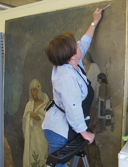 "Navaho" being cleaned by Chief Conservator of Murals Dr. Margaret Nowosielska.