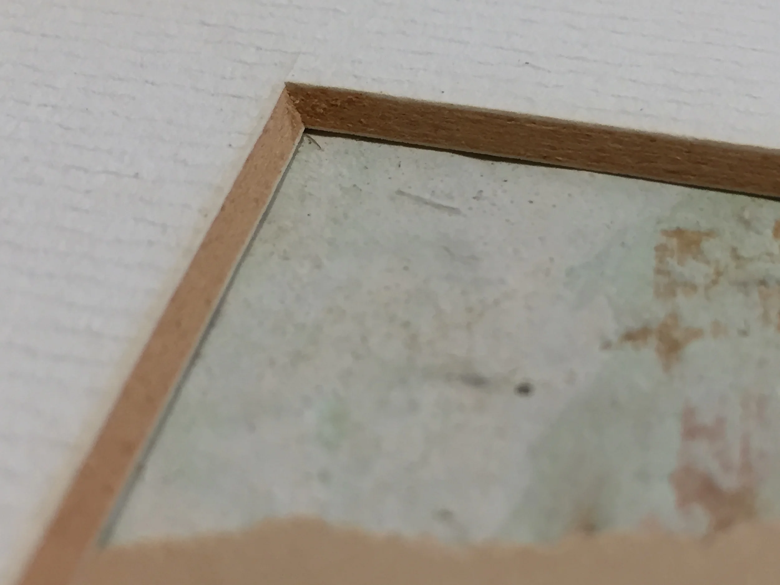 Discoloration in the matboard indicated by the darkened beveled edge is evidence that acid is present.