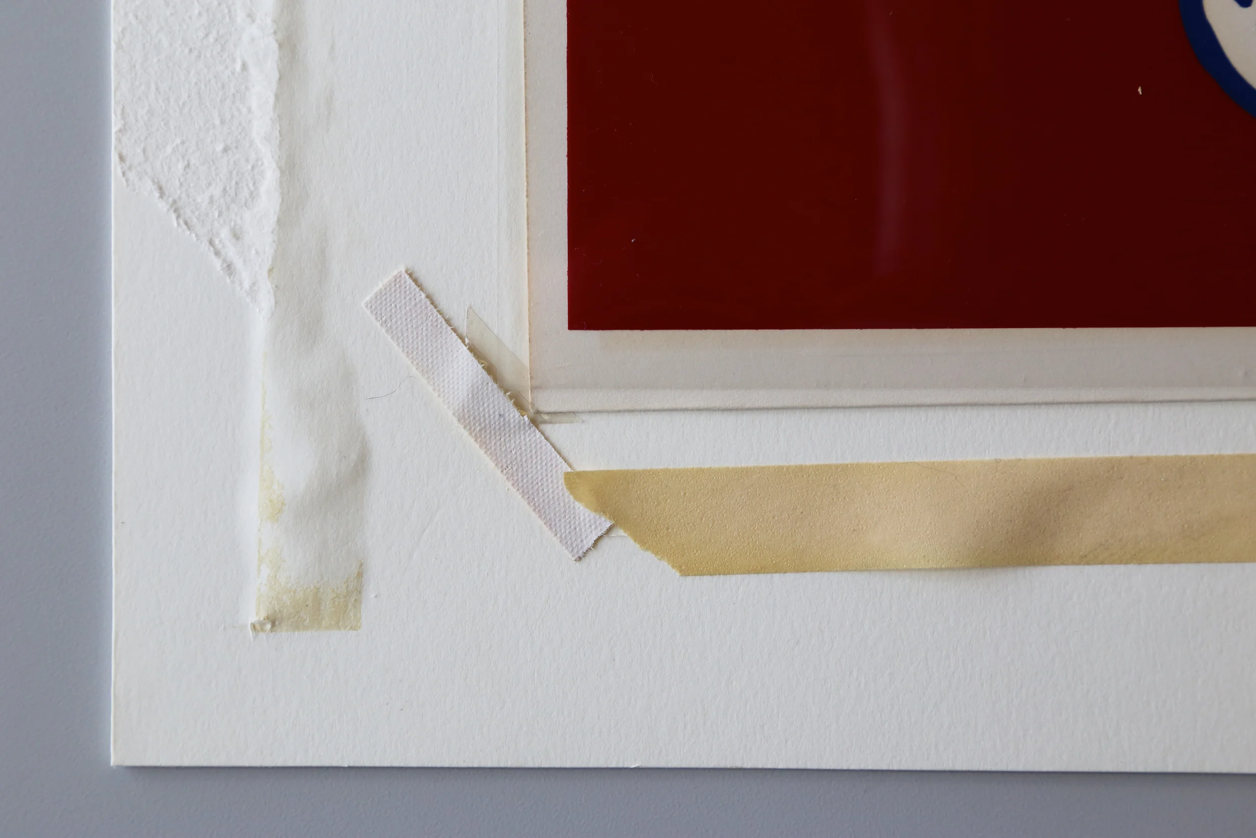 While the mat and mount serve an important purpose, hinges are what actually secure the artwork in place. When hinging works on paper, Kozo tissue, a very thin, but strong, Japanese paper should be used whenever possible. The hinge is best applied with reversible adhesives such as wheat starch paste or methylcellulose, both of which are water-based. Non-archival tapes and irreversible adhesives will damage the works, prompting skinning, tears, or staining to the paper support. Other non-invasive options are photo corners or sink mats because they are easily reversed and do not physically alter the artwork. (please refer to the sink mat article in the newsletter for more details)