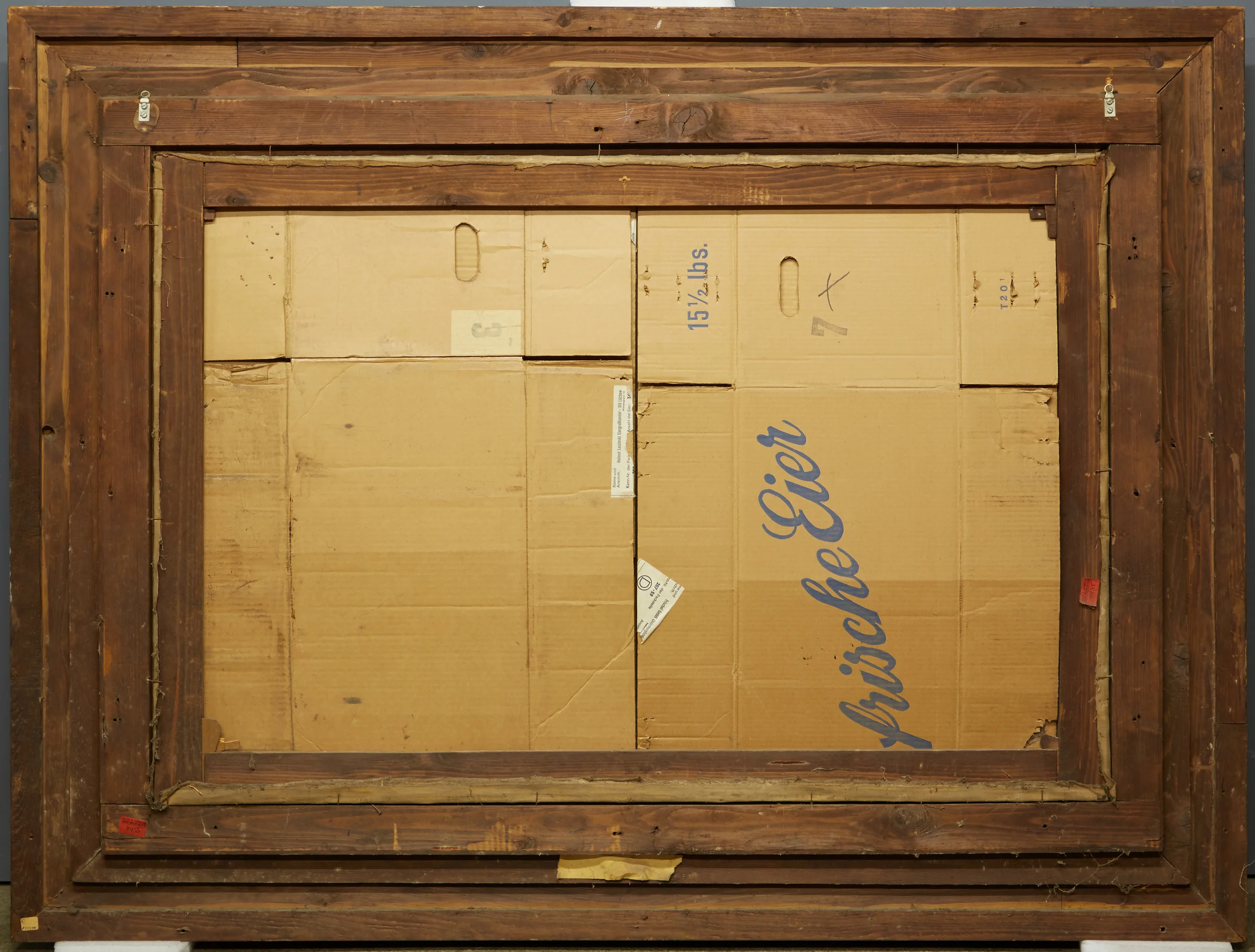 Backing boards protect the back of the artwork and provide rigidity and support inside the frame. Paintings that are unframed should have a backing board as a precautionary measure to protect the back of the piece from impact as well as dust and debris. A preferred material for backing is Coroplast; which is a corrugated polypropylene board that is rigid, resistant to puncture and moisture. Other appropriate materials include archival 8-ply mat boards and archival corrugated blue boards. Non-archival materials such as foam board, cardboard, and wood are harmful and should be replaced.