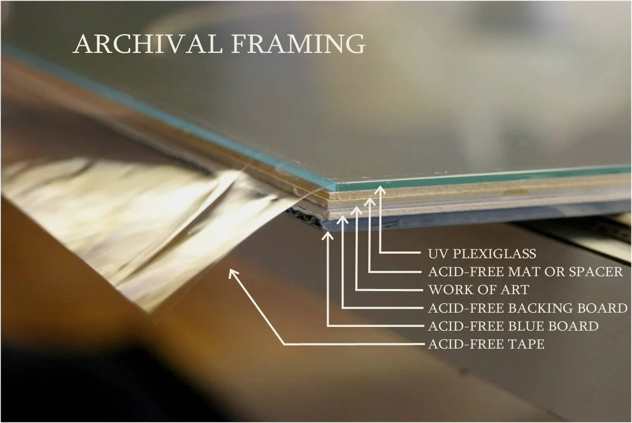 An archival tape such as Tyvek or J-Lar should be used to seal the framing package within the frame.