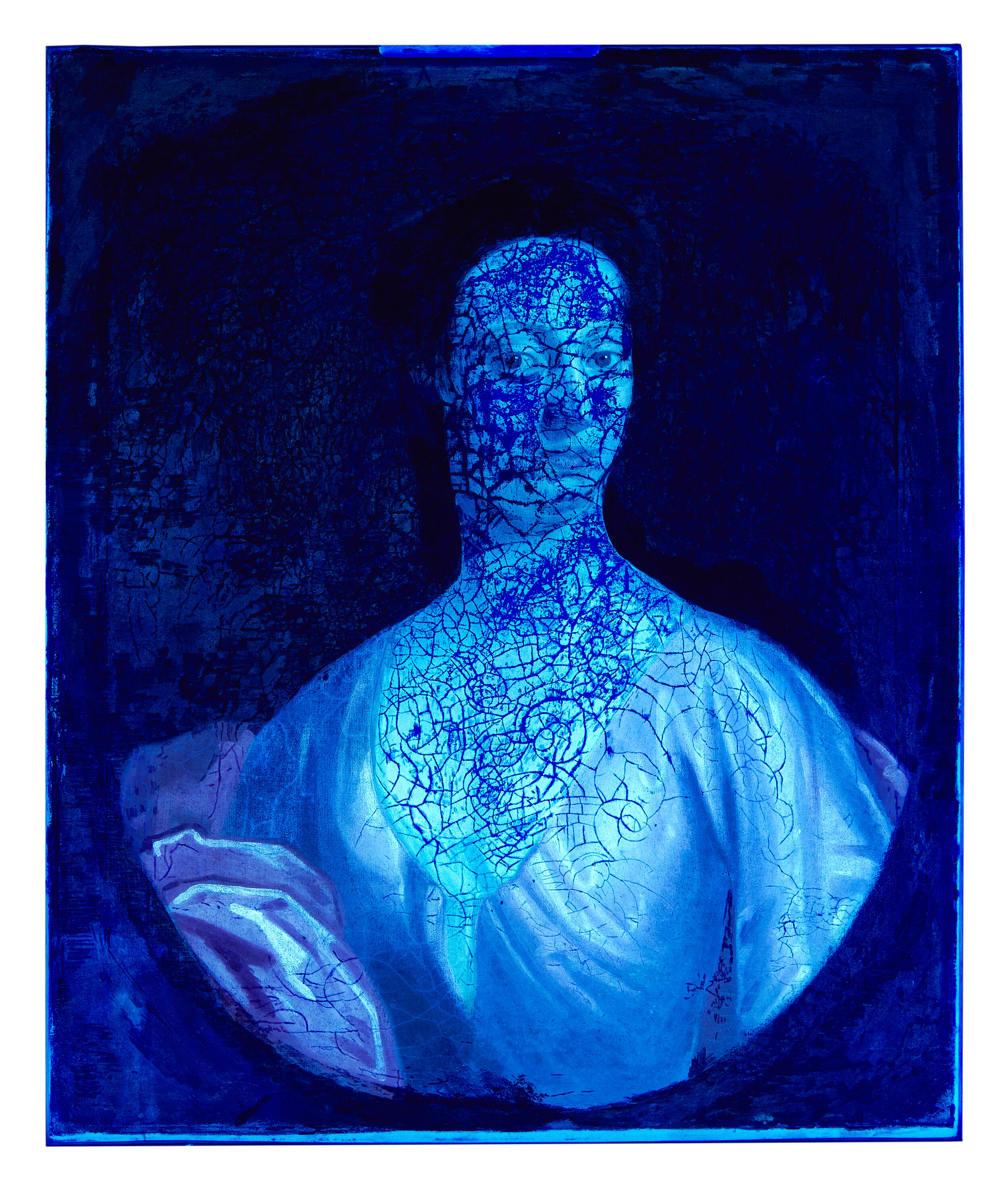 When this piece was first brought to the center, the thin to moderately applied oil paint layer had accumulated some light surface grime. There appeared to be a network of fine cracks in the paint and varnish of the painting and some areas of paint loss and accretions, coated in a natural varnish with a top synthetic varnish. Several sunken varnish spots appeared more matte than others, and our conservator's examination also identified extensive repaint on the face, neck and most of the background.