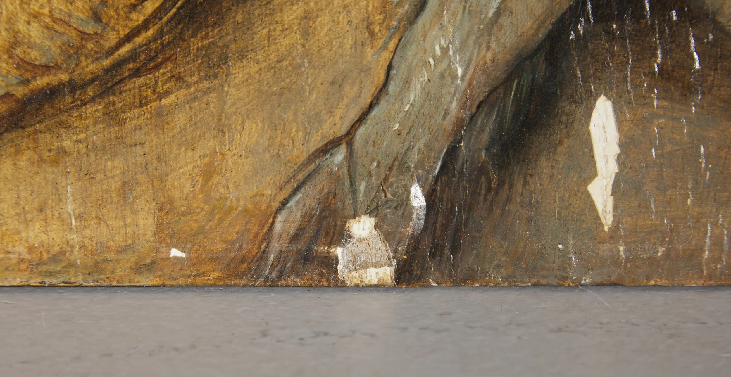 The examination also revealed extensive previous retouching along the painting's bottom 1" and top 3" and along areas of flaking paint. The previous repaint corresponds to areas now flaking. The areas of the previous repaint still matched the surrounding paint acceptably. The fill material used had not been moving with the wood grain to the same extent as the original paint layer; however, this is to conservation standards and is expected in the treatment of panel paintings. Conservators always want the repair to be weaker than the original material, so it will fail if there are structural fluctuations. The painting appeared to have been varnished with synthetic varnish and exhibited a light layer of surface grime.