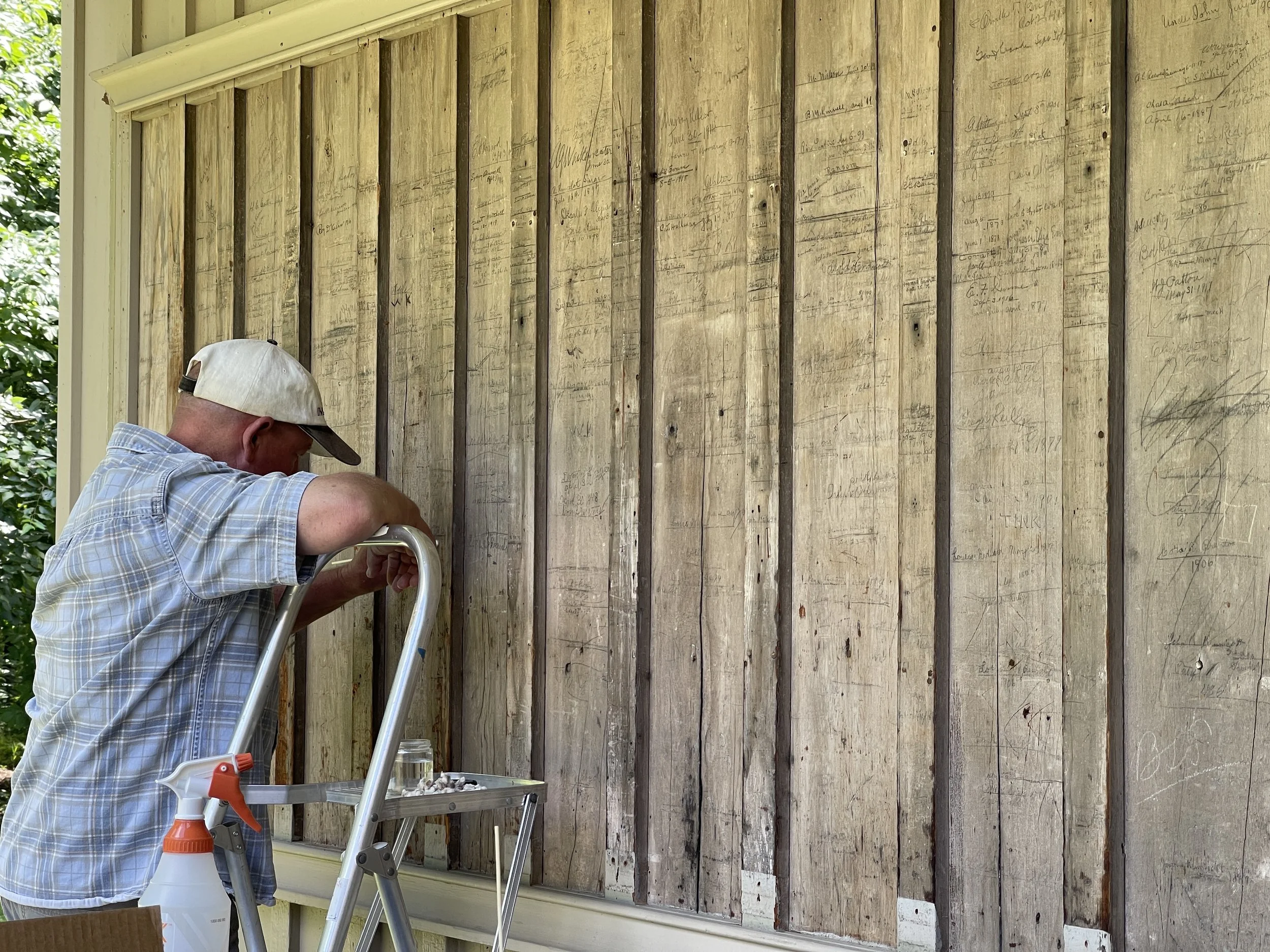 The team also employed a consolidant to stabilize severely damaged wood structure and areas of dry rot. Tide lines on the southern end of the wall, located in lightly damaged areas, were treated to minimize contrast with unaffected surfaces. The cleaning process was followed by careful inpainting and blending areas of severely deteriorated surface on the southern end of the wall using conservation pigments and dry pastels, locally sealed with fixative. Elizabeth Kopp, archivist for The Grove, shared how much of a difference the cleaning made to the legibility of the signatures, “The work was incredible. We'll now be able to take the names and try to figure out who they are, which we have wanted to do for quite a long time.”