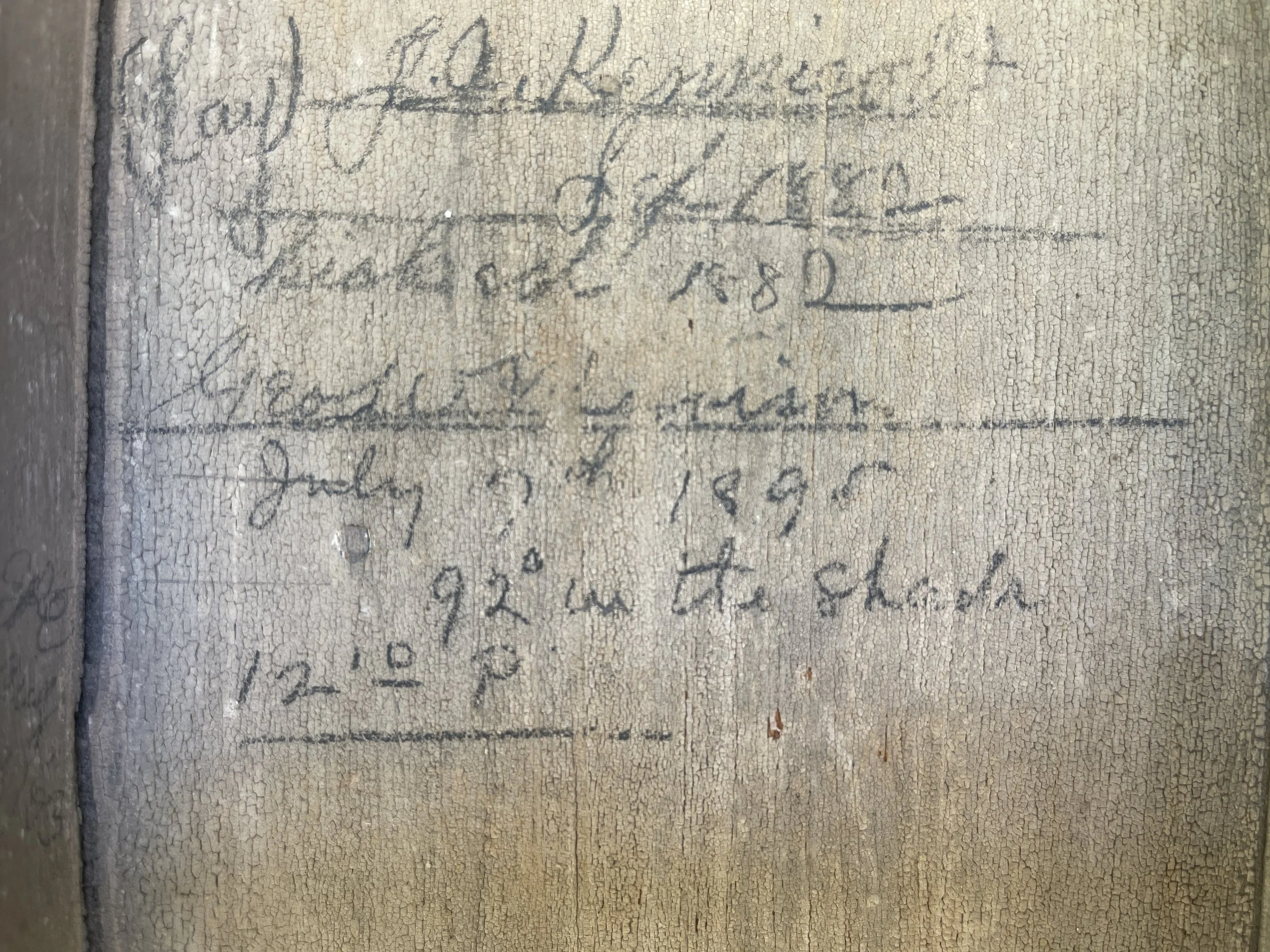 Kennicott House Signature Wall, detail with the day’s weather: July 7th (or 9th) 1895, 92° in the shade, 12:10 pm