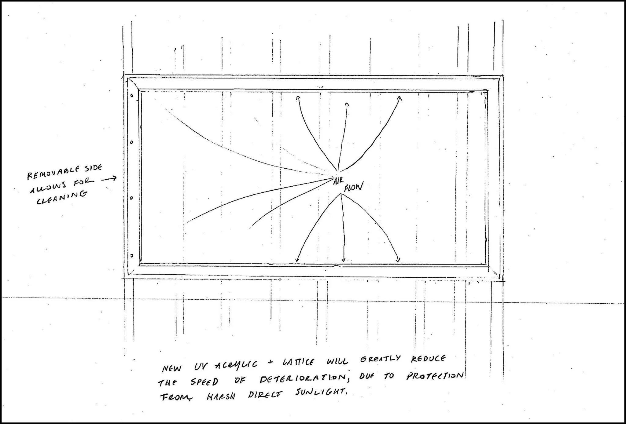 Suz shared, "Between the batons, openings at the top and bottom of the frame create airflow. The previous framer had blocked those spaces in with cedar. We carefully removed the blocks, carved a dado in them, and then reinstalled them. As the sun heats the wall, the airflow should be able to cool it down as temperatures fall, rather than retaining the heat." The design includes a removable rail, making it easier to slide out the acrylic sheet for cleaning and maintenance. Furthermore, to mitigate the effects of sunlight, the new acrylic is UV filtering glazing that will help deflect some of the sun's harmful rays.