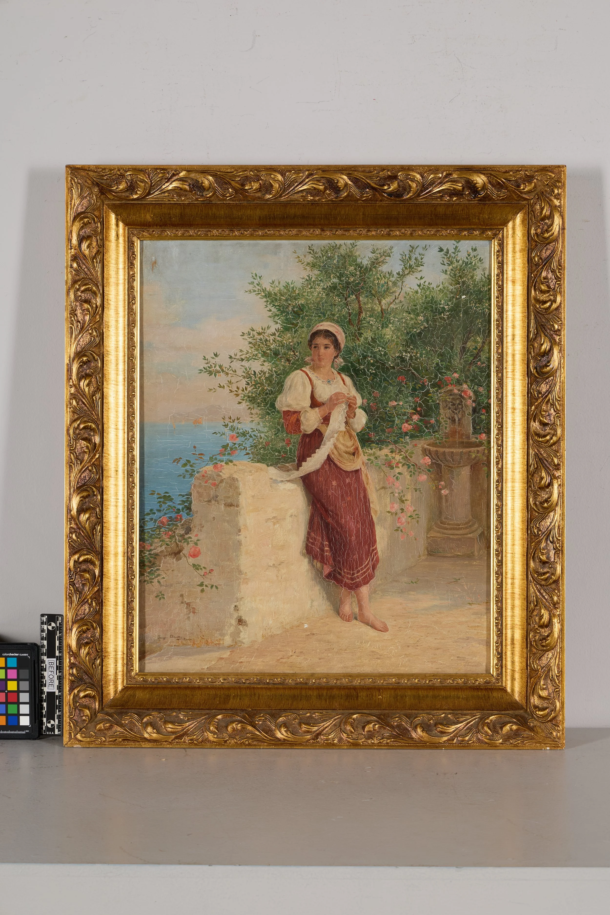 Luigi Olivetti (1856–1941) was an Italian painter active in Rome and throughout Italy. Known for his landscapes and depictions of daily life, Olivetti’s paintings are rooted in the tradition of genre painting, which captures ordinary moments with sensitivity and artistry. Unlike portraits, religious imagery, or grand history scenes, genre works highlight the beauty in everyday life. Olivetti worked during a period of transition in Italian art, when painters balanced academic traditions with new stylistic currents of the early modern era. His works, with their balance of detail and atmosphere, preserve a lyrical, romantic sensibility while engaging with the immediacy of light and color.
