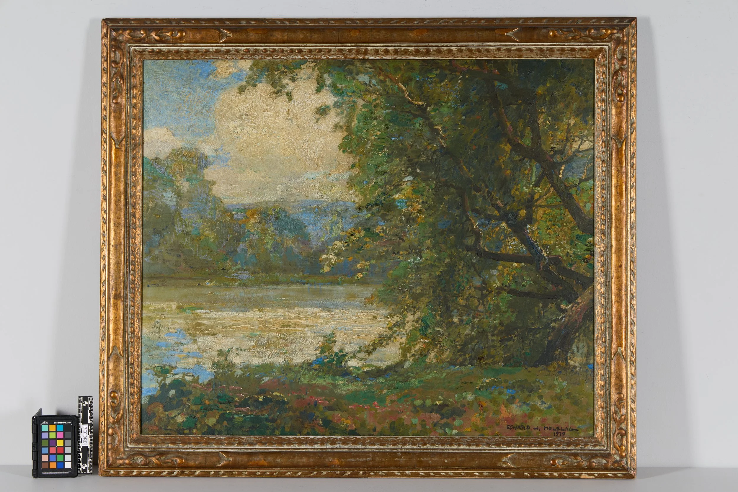 On the painted surface, a white ground layer supported moderately to thickly applied oil paint. The image was obscured by an uneven, discolored natural resin varnish and a layer of surface grime. Frame abrasions were visible along all four edges, with small paint losses scattered over the surface. The painting was signed in the lower right corner, “Edward J. Holslag / 1919.”
