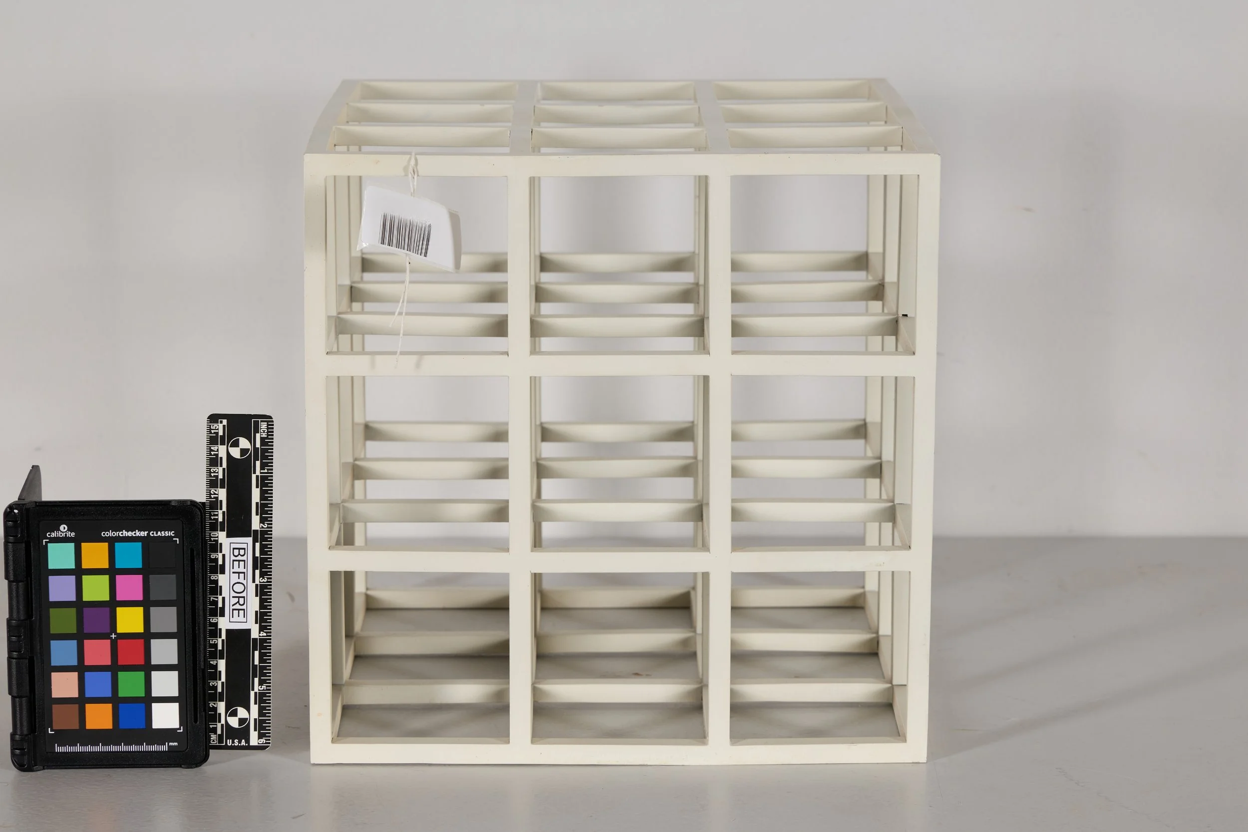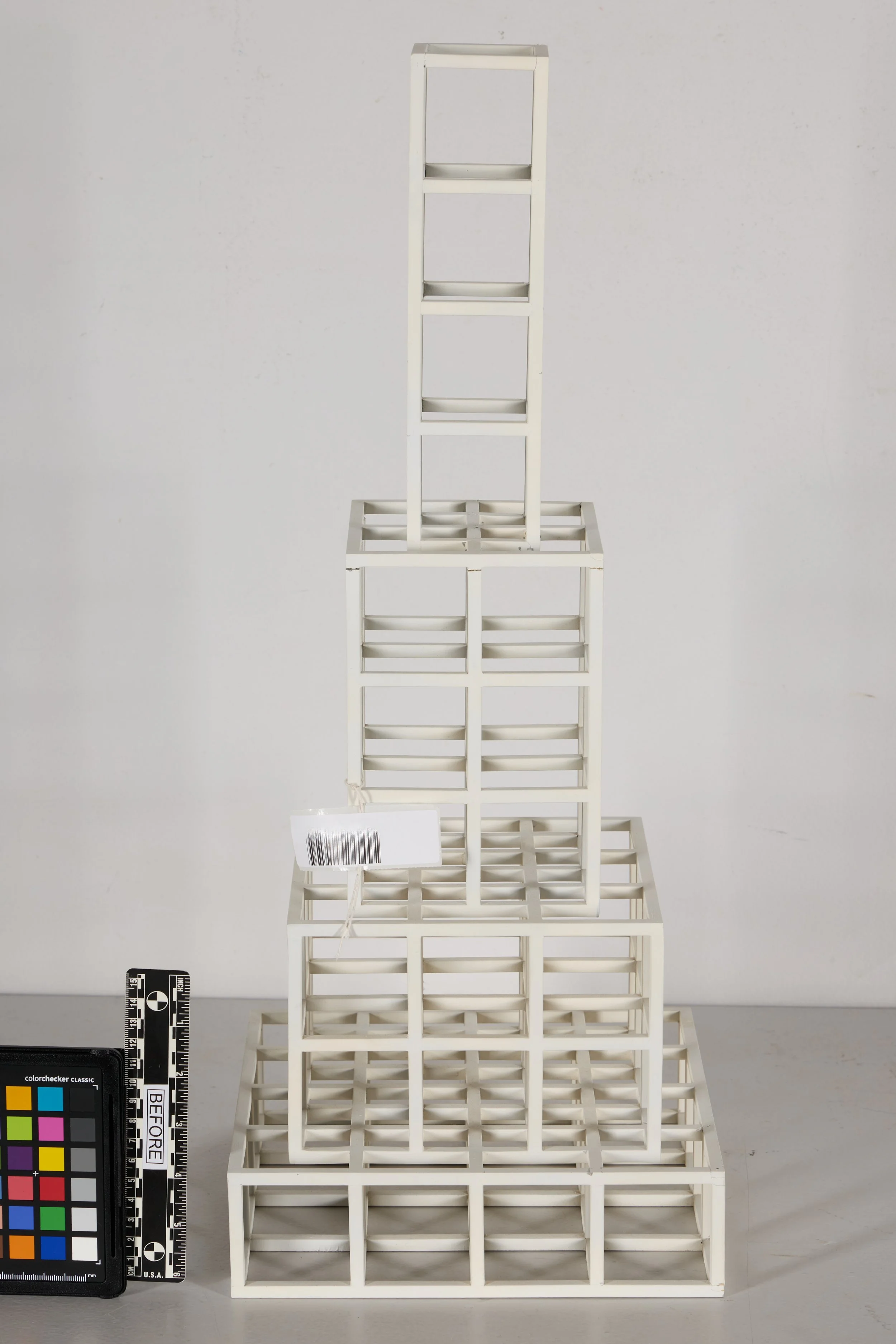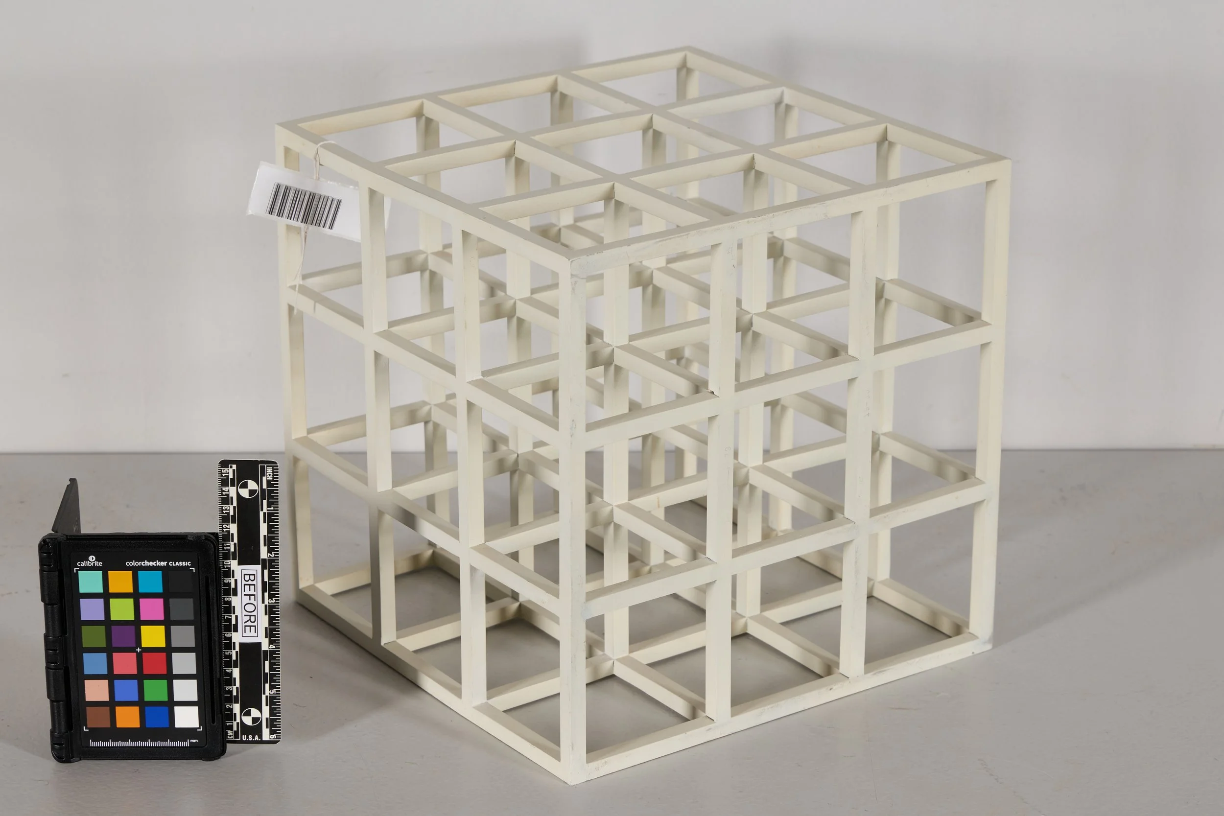 The second work, 4 x 4 x 1, was constructed from square aluminum bar stock assembled with metal pin joinery and spray-finished with white enamel paint. The sculpture consisted of four stacked rectangular tiers, each formed as a square grid, creating a vertical, tower-like structure. Condition issues varied across the tiers. In the upper tier, two joints were loose along one side, and multiple circular indentations from metal pins were visible at the outer edges of the vertical bars, some with associated paint loss. Cracking was present at nearly all joint lines, along with localized paint losses, black accretions, and surface grime. The second tier exhibited more pronounced structural instability, including complete separation at several joints connecting the upper grid, with gaps ranging from hairline fractures to approximately one-eighth of an inch. These separations were accompanied by cracking at lap joints, paint losses, brown accretions, and accumulated grime. The third tier showed more limited paint cracking and losses, minor abrasions at the outer corners, and evidence of a small prior paint repair. The bottom tier displayed moderate cracking at the joints, abrasions at exposed edges, black accretions, paint losses at pin locations, and several earlier restorations that were visually mismatched and excessively applied.