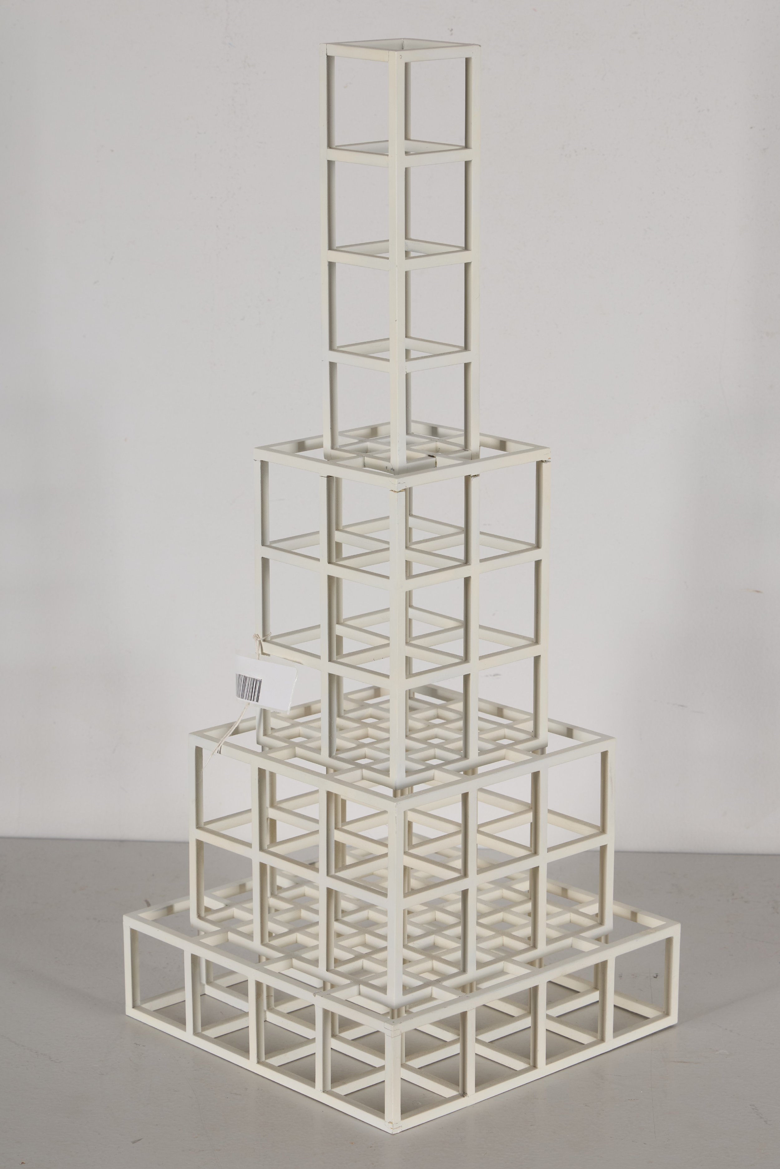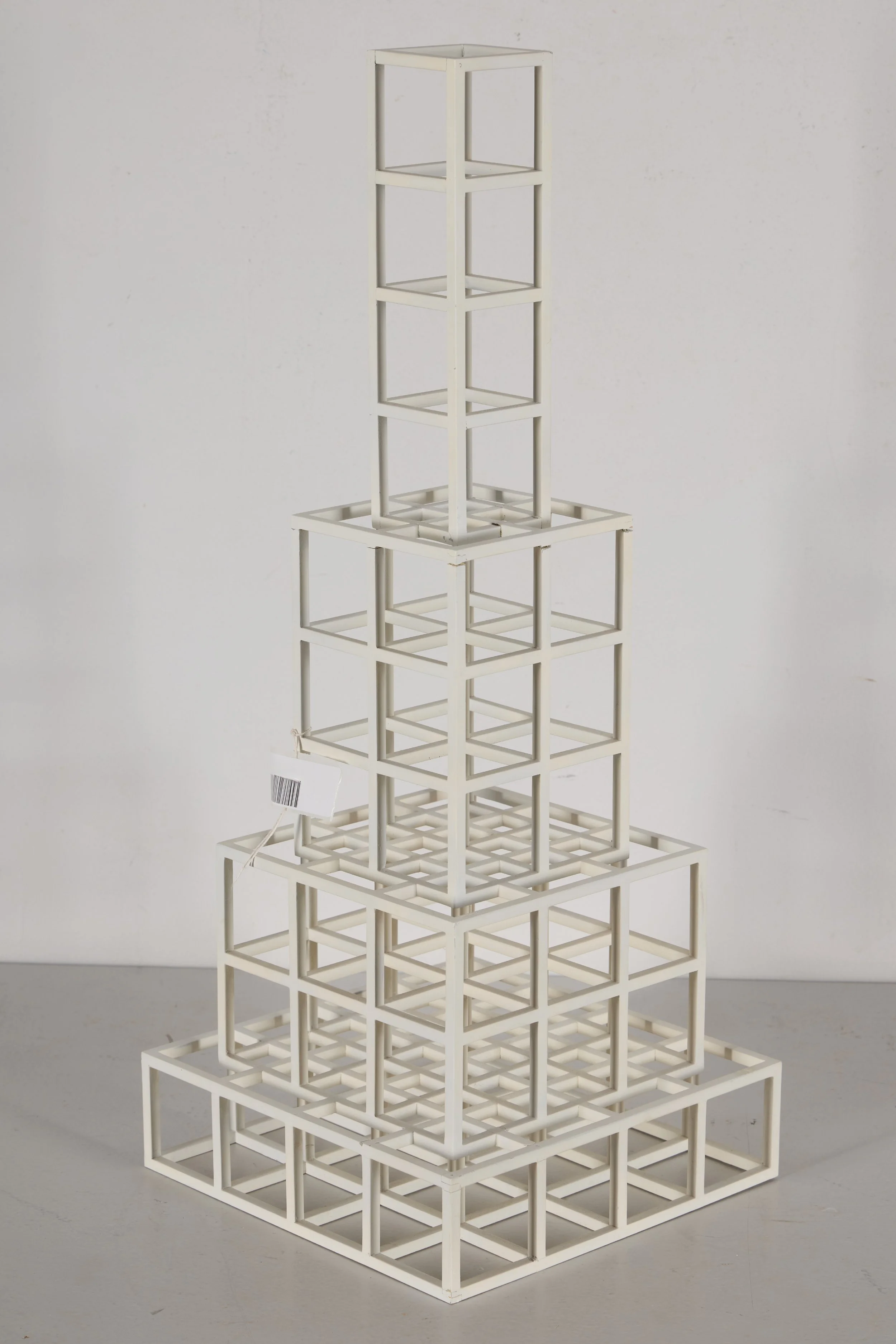 Cube, dated 1979 and signed on the base with a punched year and edition number, was constructed from square aluminum bar stock. The joints were welded and ground flat, and the surface was finished with white enamel paint. Subtle irregularities in the bars, including slight bowing and variations in thickness, were present and were understood as inherent to the fabrication process, particularly when compared with later, more mechanically precise examples from the series. Several joints displayed visible joint lines that had not been filled prior to painting, consistent with the original construction. While the structure remained stable overall, the surface exhibited heavy grime with minimal dust, scattered reddish-brown accretions, and black and grey accretions accompanied by scratches concentrated on one side, possibly the result of display in an unintended orientation. Minor paint losses and abrasions were present along the outer edges of the cube.