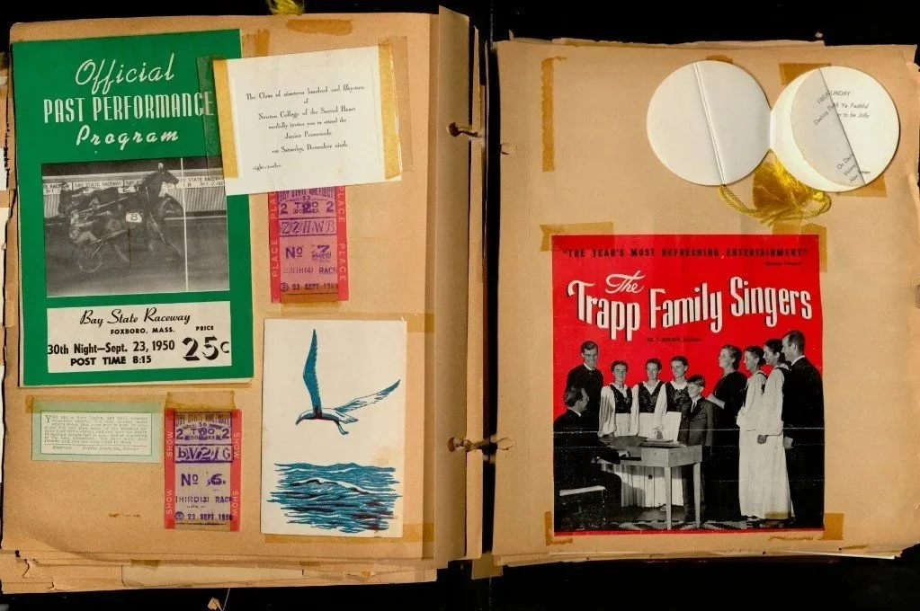 Both scrapbooks had items added over the years so different pages had various condition issues. Nearly every page was filled. Items were attached with tape, often placed directly over the front of photographs and paper materials, and in some cases glued down. The adhesives had discolored over time, leaving staining and residue. There was also a layer of surface dirt across the albums and individual pages.