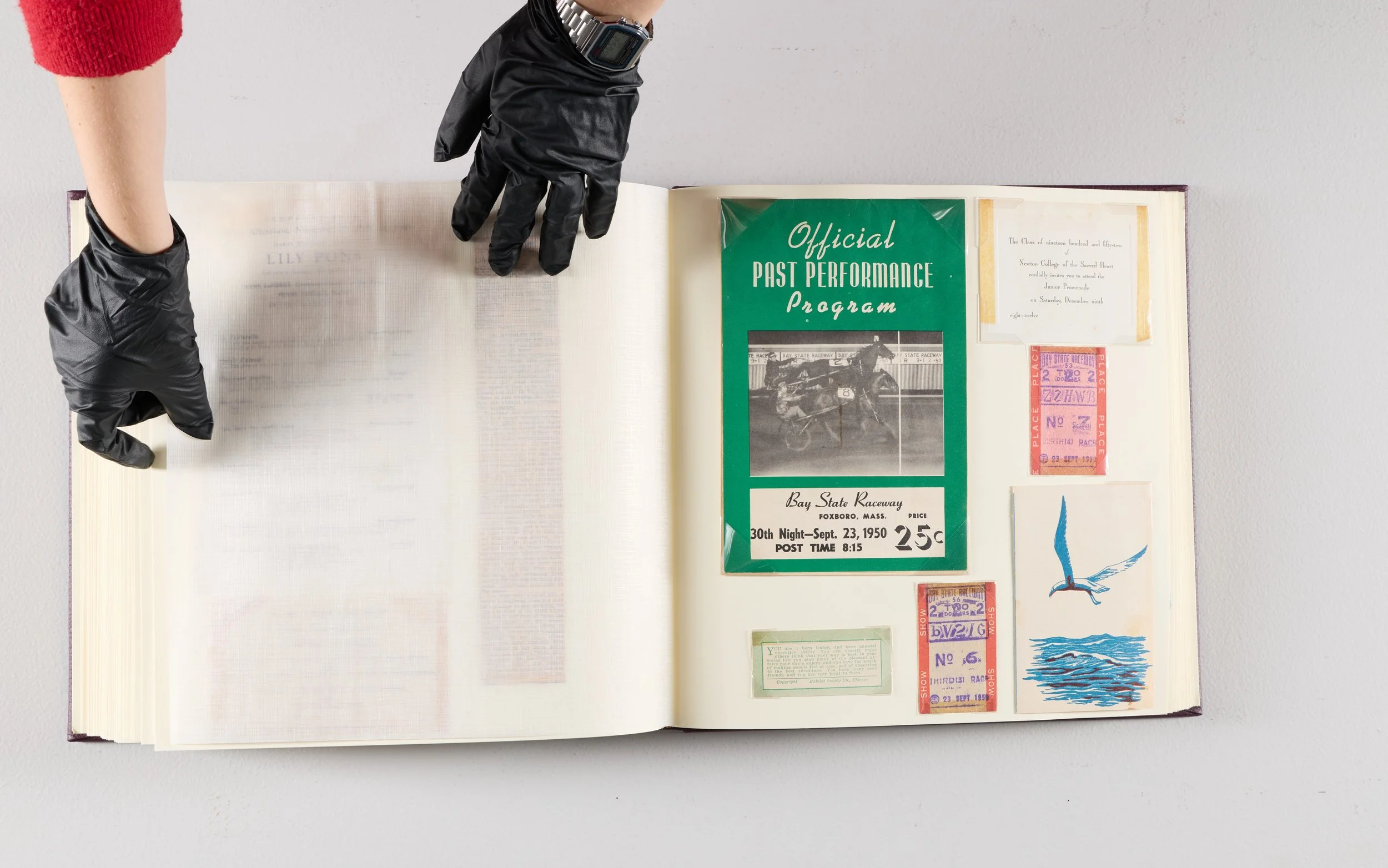 Treatment by associate conservator of works on paper, Katrina Flores, focused on stabilizing the materials and making the scrapbooks functional again. Each scrapbook was documented before work began. The items were carefully mechanically removed from the pages. Tapes were removed and adhesive residue was reduced mechanically. Each item was gently surface cleaned using dry cleaning methods. Then, each item was flattened and repaired where necessary.
