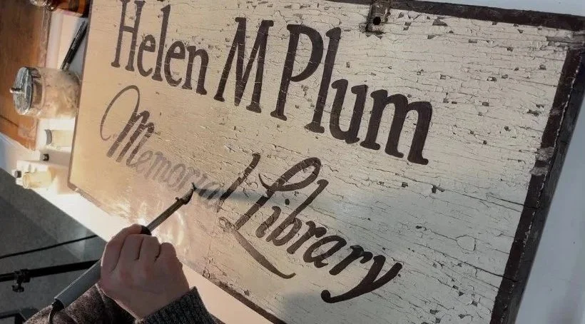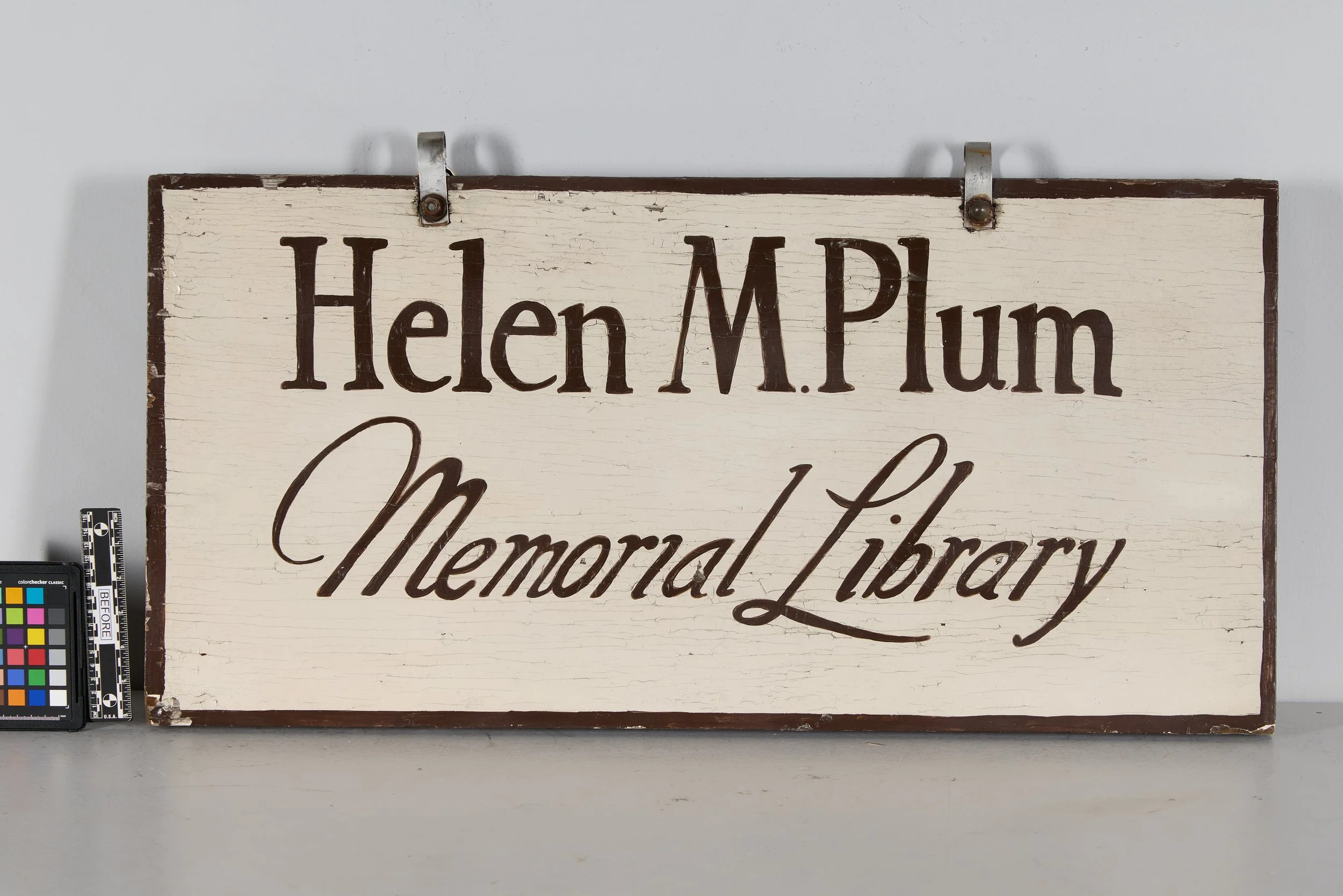 Last year, The Conservation Center had the privilege of conserving a pastel portrait of Helen Plum for the library that bears her name in Lombard, Illinois. Not long after that project was completed, another piece of the library’s history came to our laboratories for treatment: the original hand-painted sign that had once hung outside the Helen Plum Library.