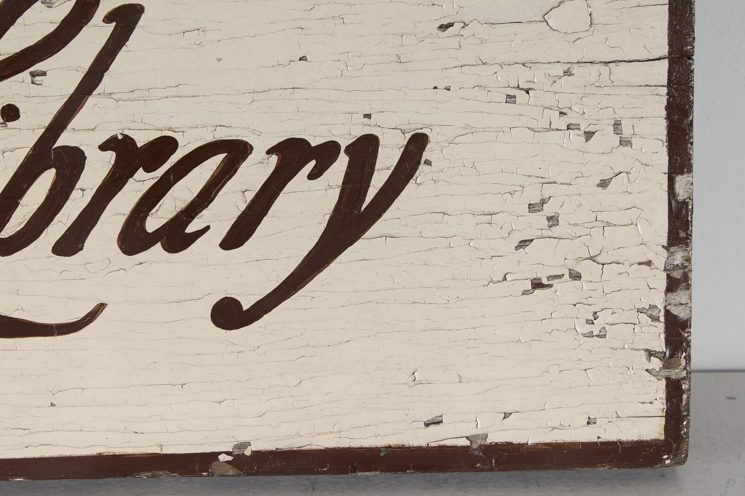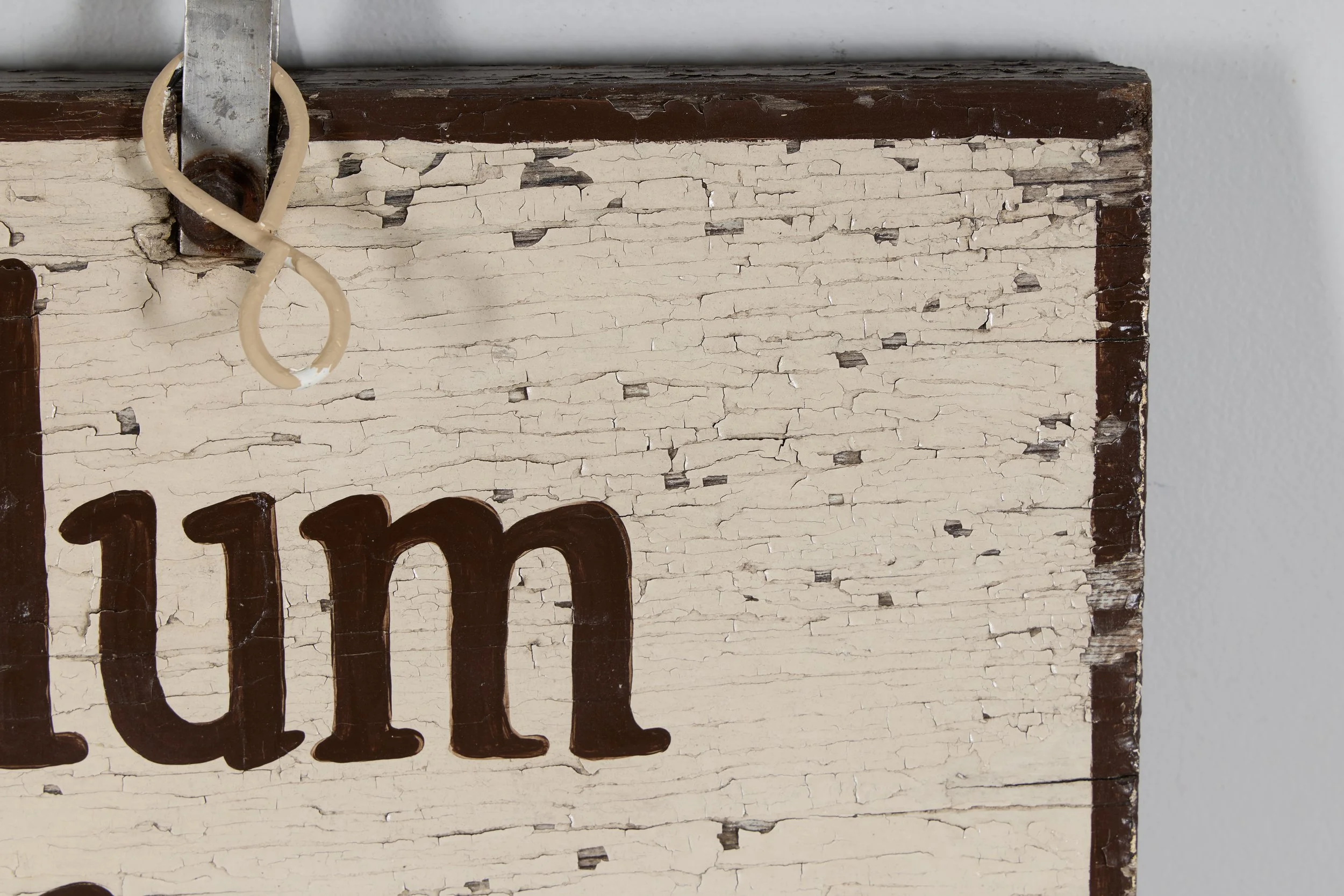 A varnish coating had also been applied at some point in the sign’s history. This layer, possibly a commercial finish such as polyurethane, appeared to cover primarily the white background and outer edges. The lettering may have been applied after this coating was in place. The surface also carried a light layer of accumulated grime.