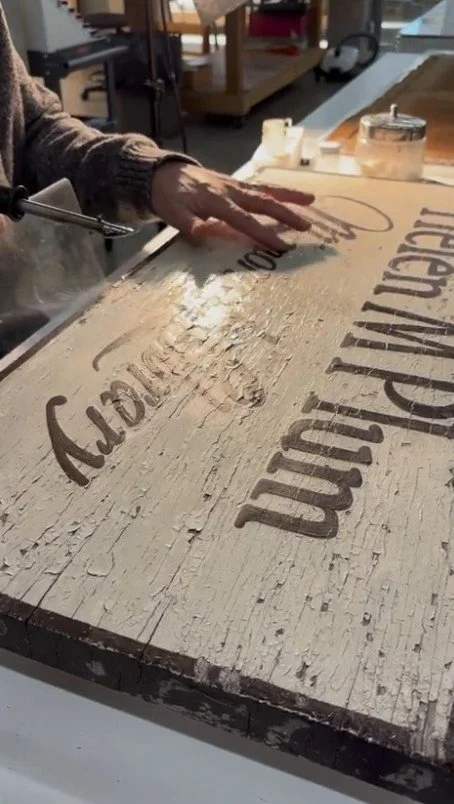 Before treatment began, the sign was photographed for in-house documentation. Then, our senior paintings conservator Michael Young addressed the areas of lifting and flaking paint. These fragile sections were consolidated overall using appropriate conservation adhesives to secure the paint layers to the wooden support.