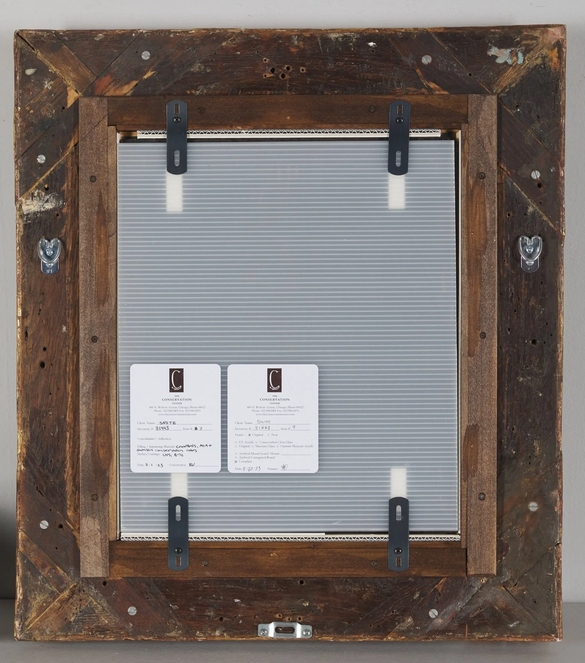 With the treatment of both items complete, the Custom Framing and Display Department began the reframing process. Associate Conservation Framer Suz Evans noted that the clips on the back of the frame were peculiar but designed specifically for this panel painting, as panels are known to move and warp over time in response to temperature and humidity changes. As a result, Suz shared, "I added acid-free matboard shims to distribute the pressure from the clips evenly. The clips follow the vertical wood grain of the panel so as not to strain the curved shape of the wood further; this is why the clips are only installed on the top and bottom of the frame." Senior Conservation Framer Scott Dietrich performed the final assembly of Bathsheba into the frame.