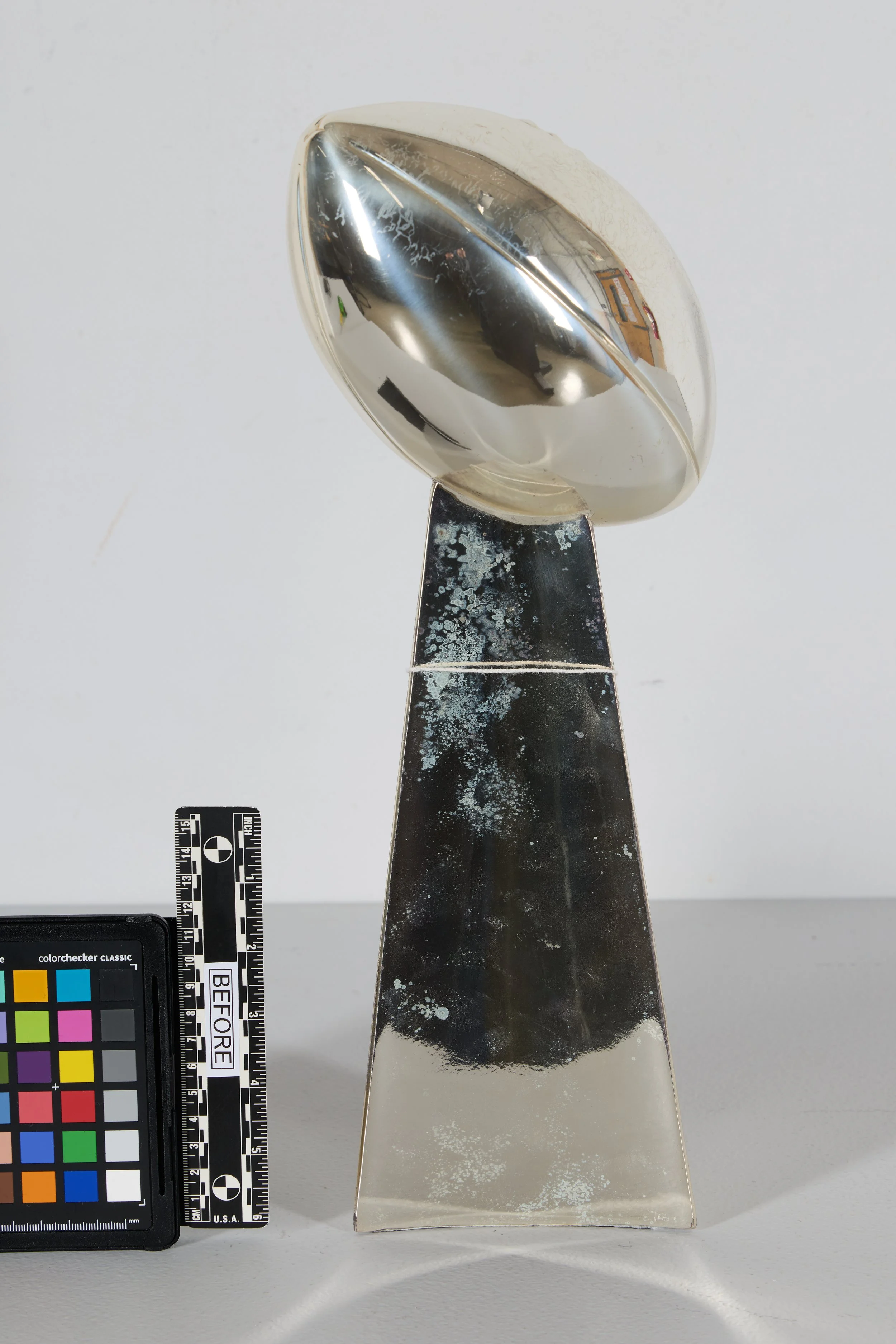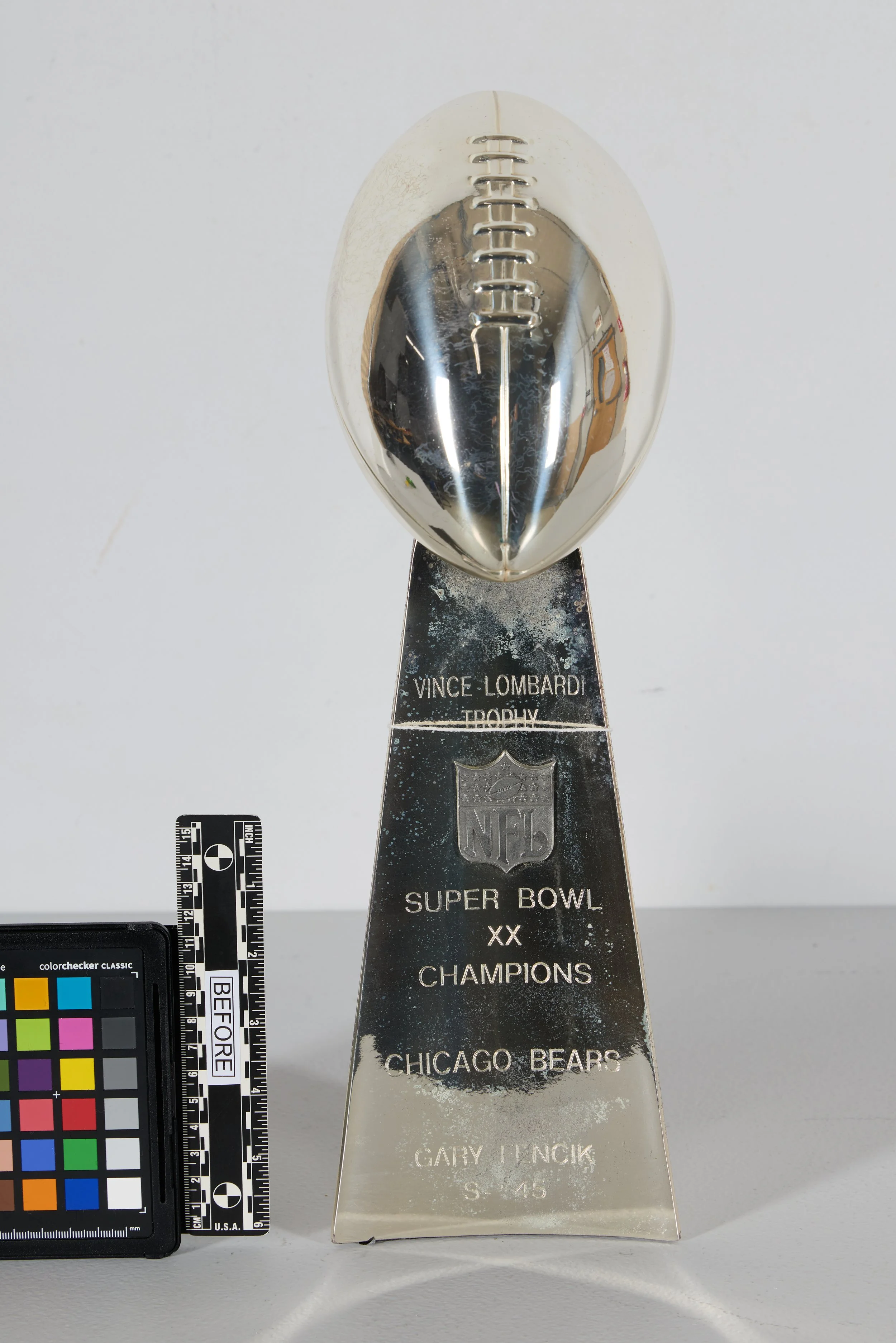 Few objects in American sports carry the symbolic weight of the Vince Lombardi Trophy, awarded to the winning team of the Super Bowl each year. The Conservation Center recently had the honor of treating two commemorative, player-owned versions of the Lombardi Trophy belonging to Chicago Bears legend Gary Fencik. Both objects date to the Bears’ historic 1985 Super Bowl victory and were produced to commemorate that championship season.