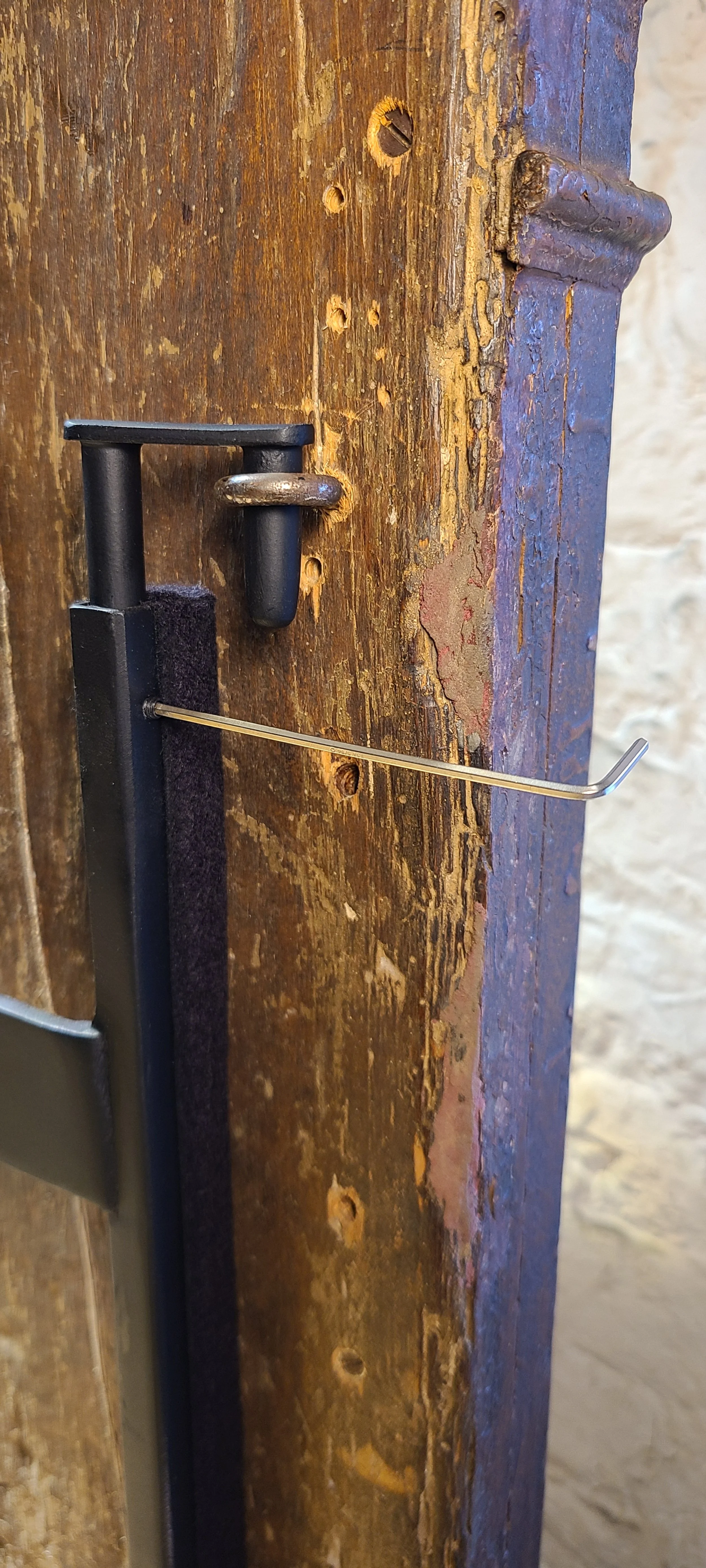 In preparation for display at the new Raclin Murphy Museum of Art, a new custom-designed mount was created to safely and discreetly exhibit Madonna and Child with Saints. Mount-making specialist Derek Sutfin fabricated a metal shelf with adjustable height top brackets that would sit in existing eye hooks on the back of the panel.