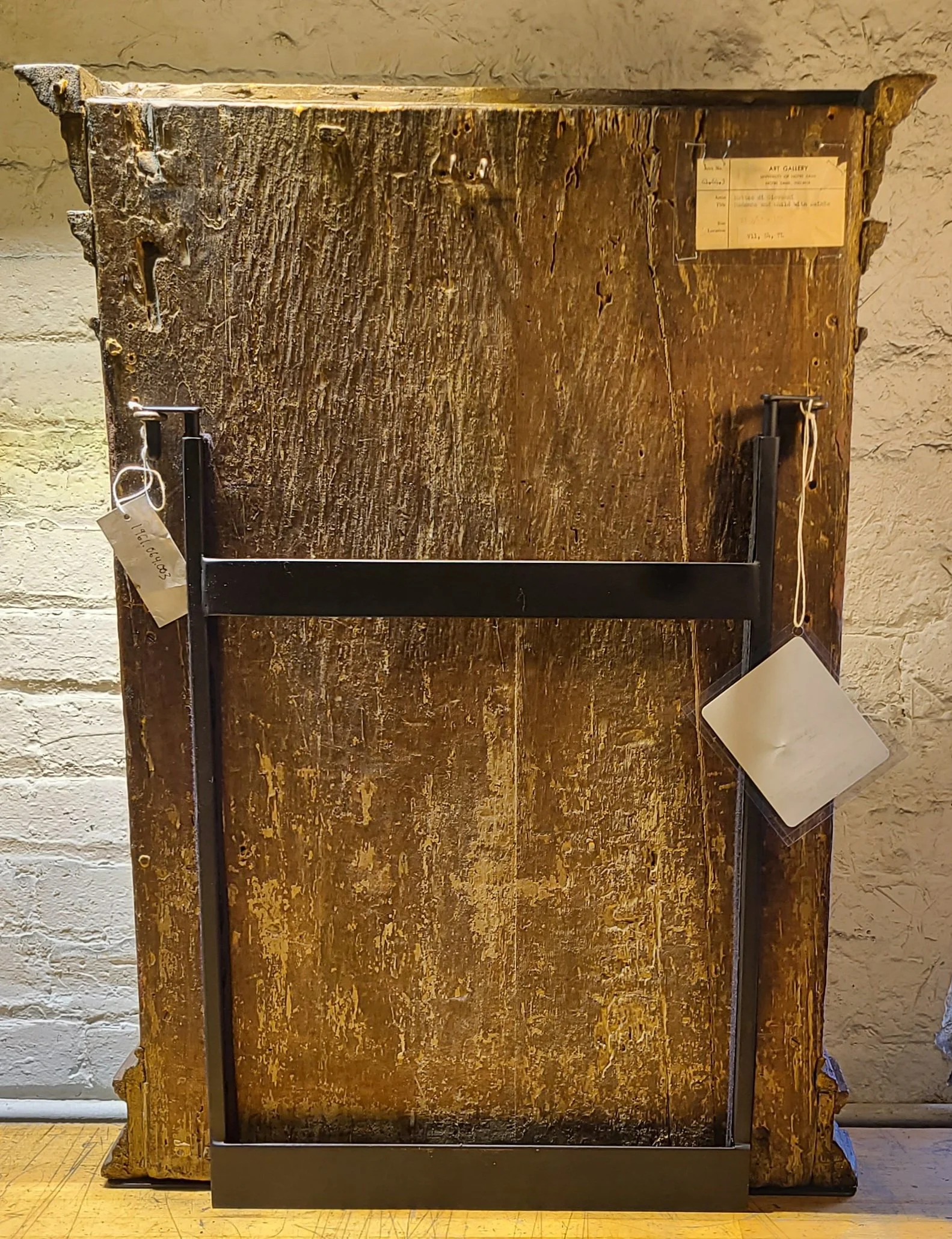 This stunning oil painting is executed on a one-inch-thick wooden panel with vertical wood grain. The frame comprises wood, gesso, paint, red bole, gold leaf, punch work, and sgraffito. The panel is both pegged into the frame with wooden dowels and screwed into the frame during a past treatment. Because of this, the painting and frame are now one unit. Both the painting and frame were stable when they arrived at The Center. A large crack on the back right of the panel runs the length of the painting, and though it is slightly open and out of plane with small, related cracks, these were determined to be stable.