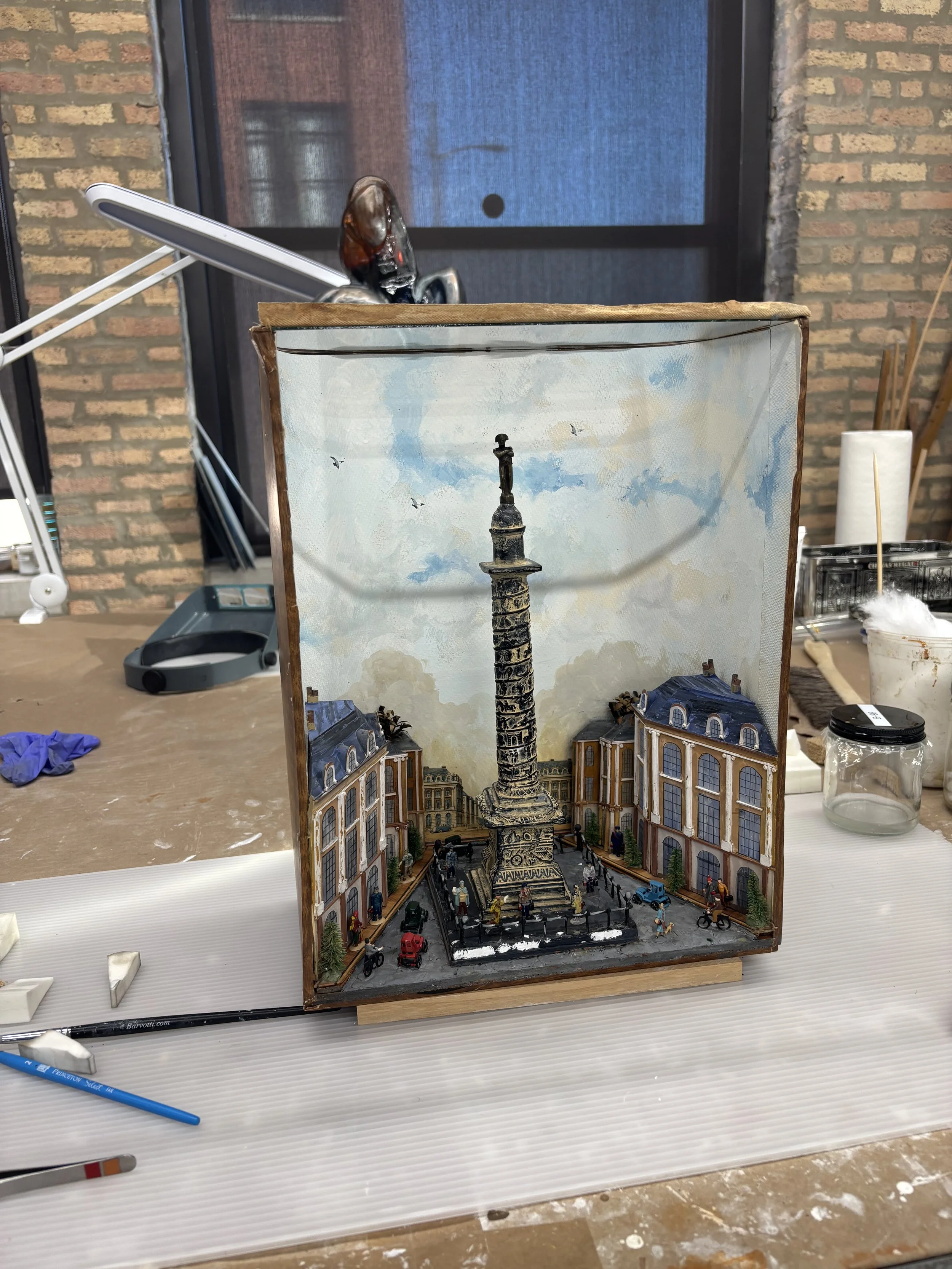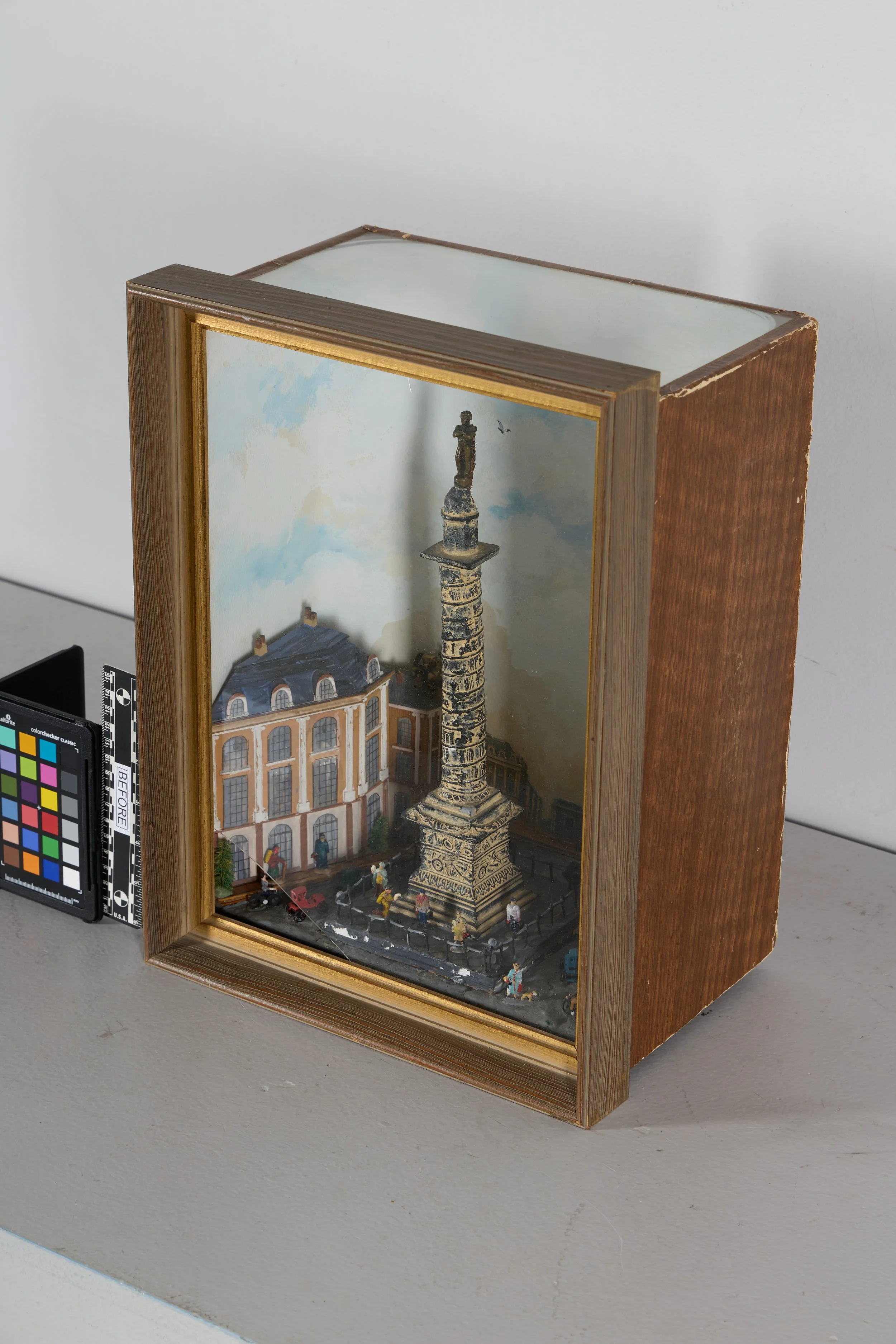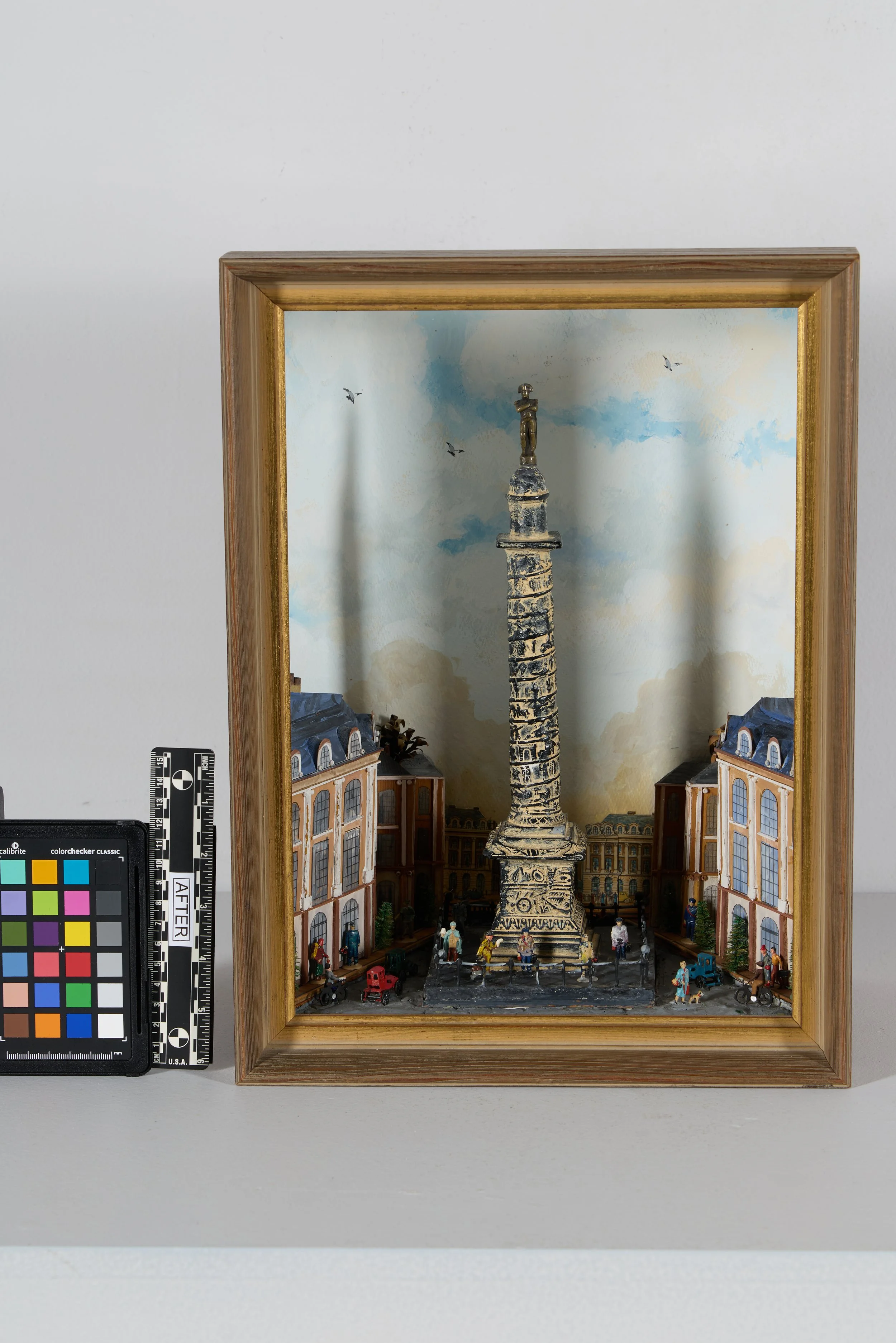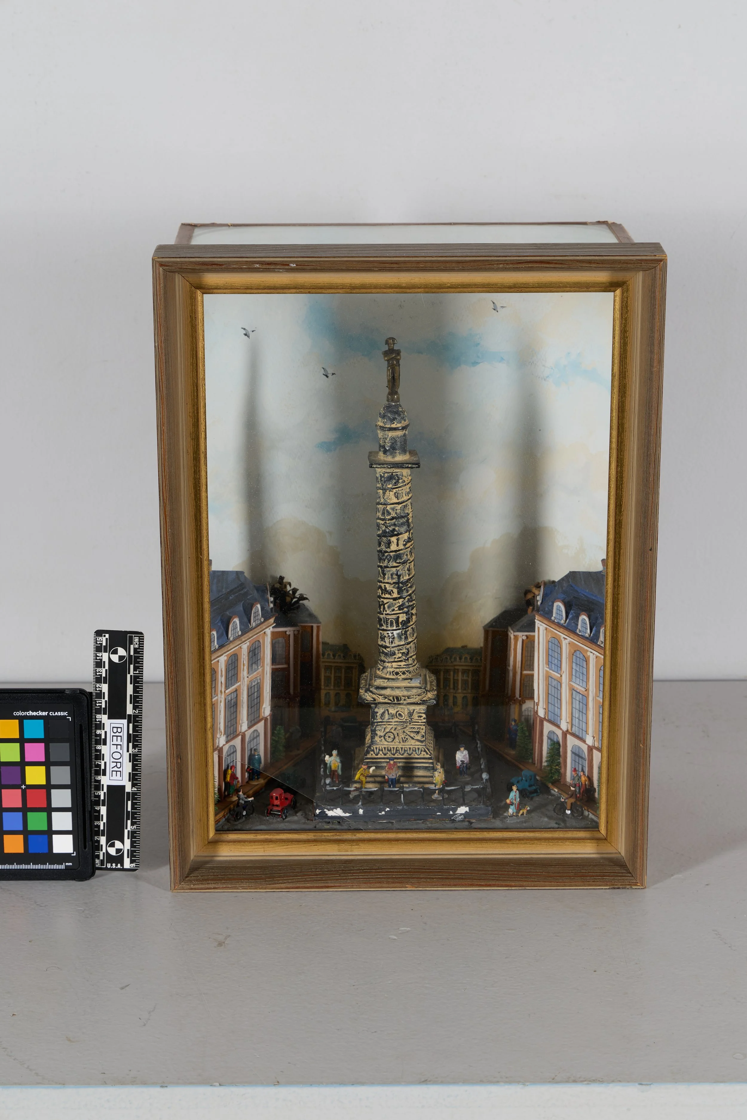 The miniature we treated depicts the Vendôme Column in Paris and was constructed from a combination of materials: plaster for the column, paper and cardstock for the surrounding buildings, metal for the figures and vehicles, and a polymer material for the trees. The painted surfaces appear to have been executed in a water-soluble medium, with the sky rendered in gouache on paper.