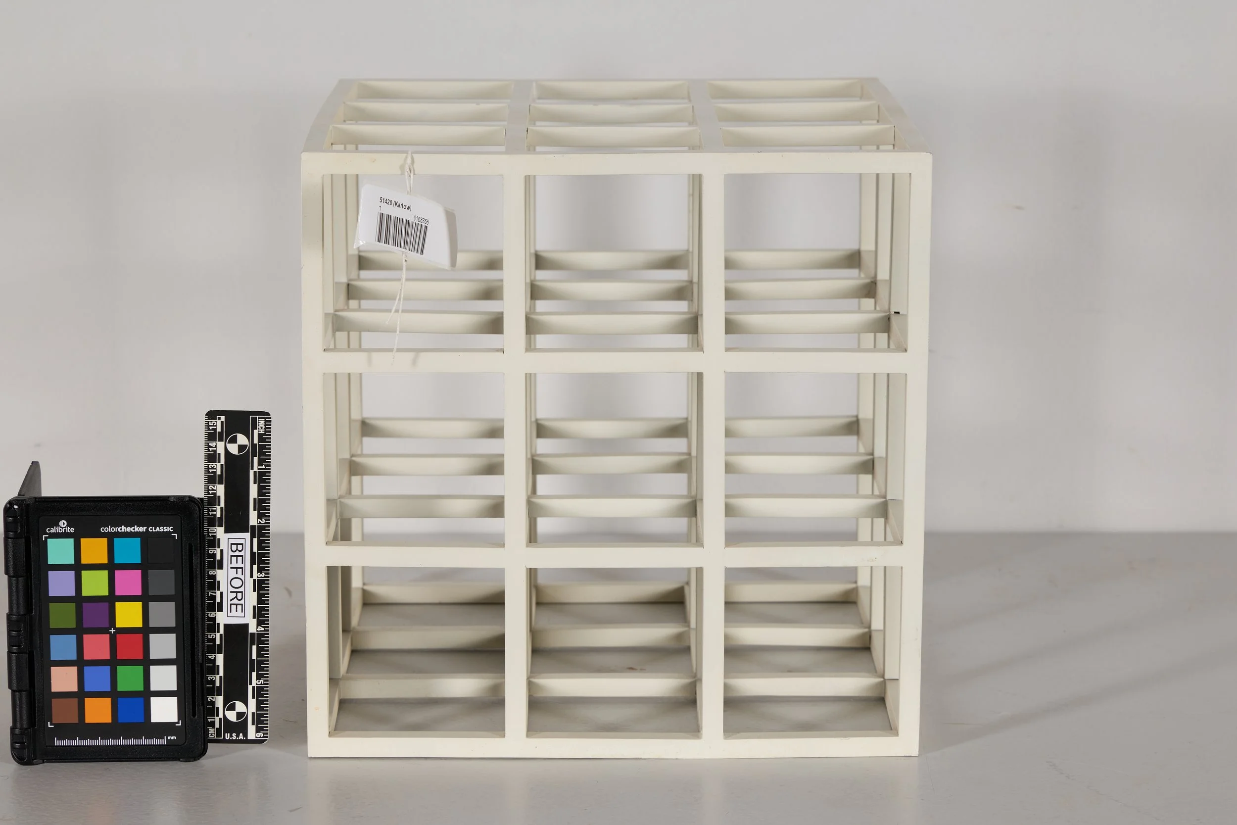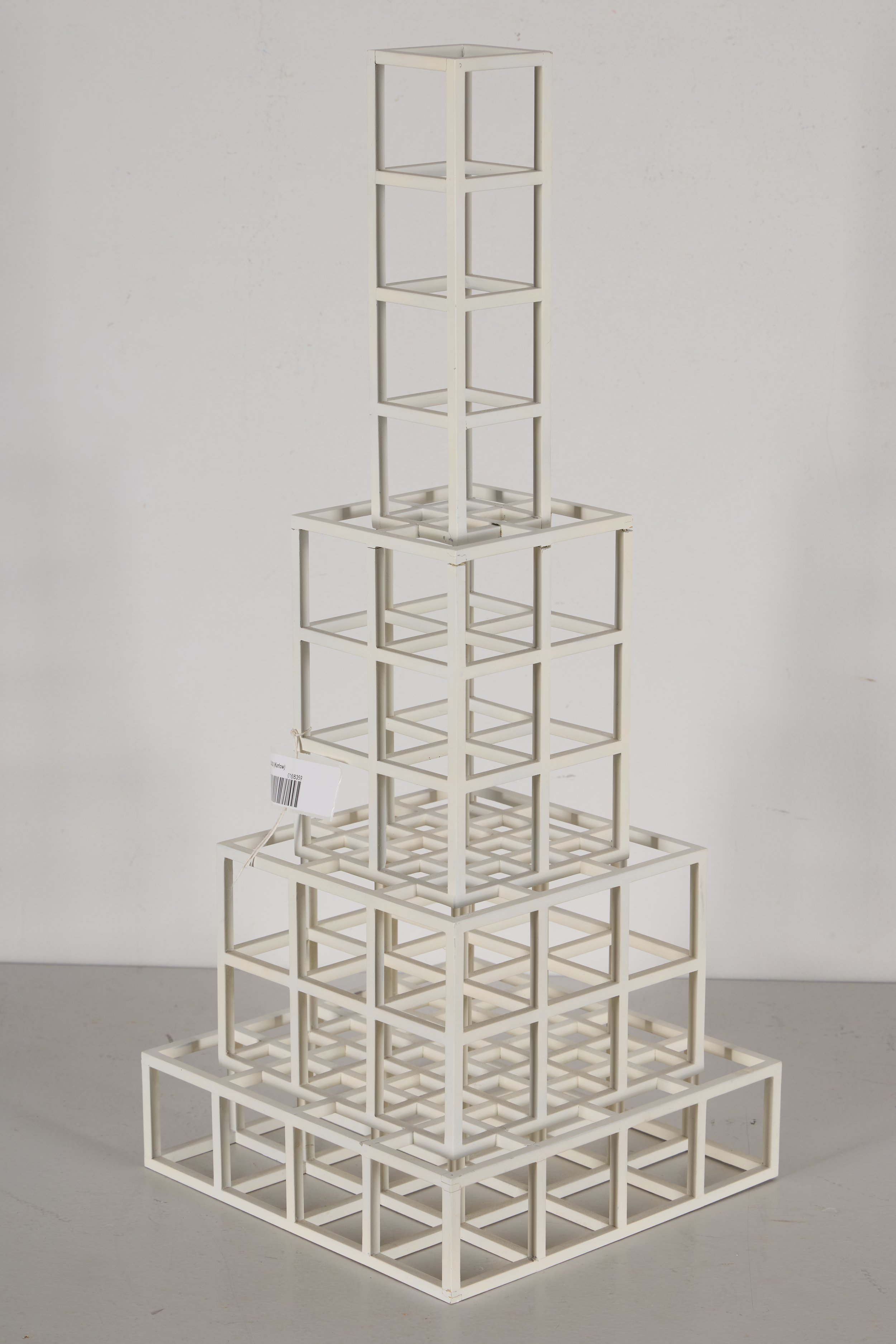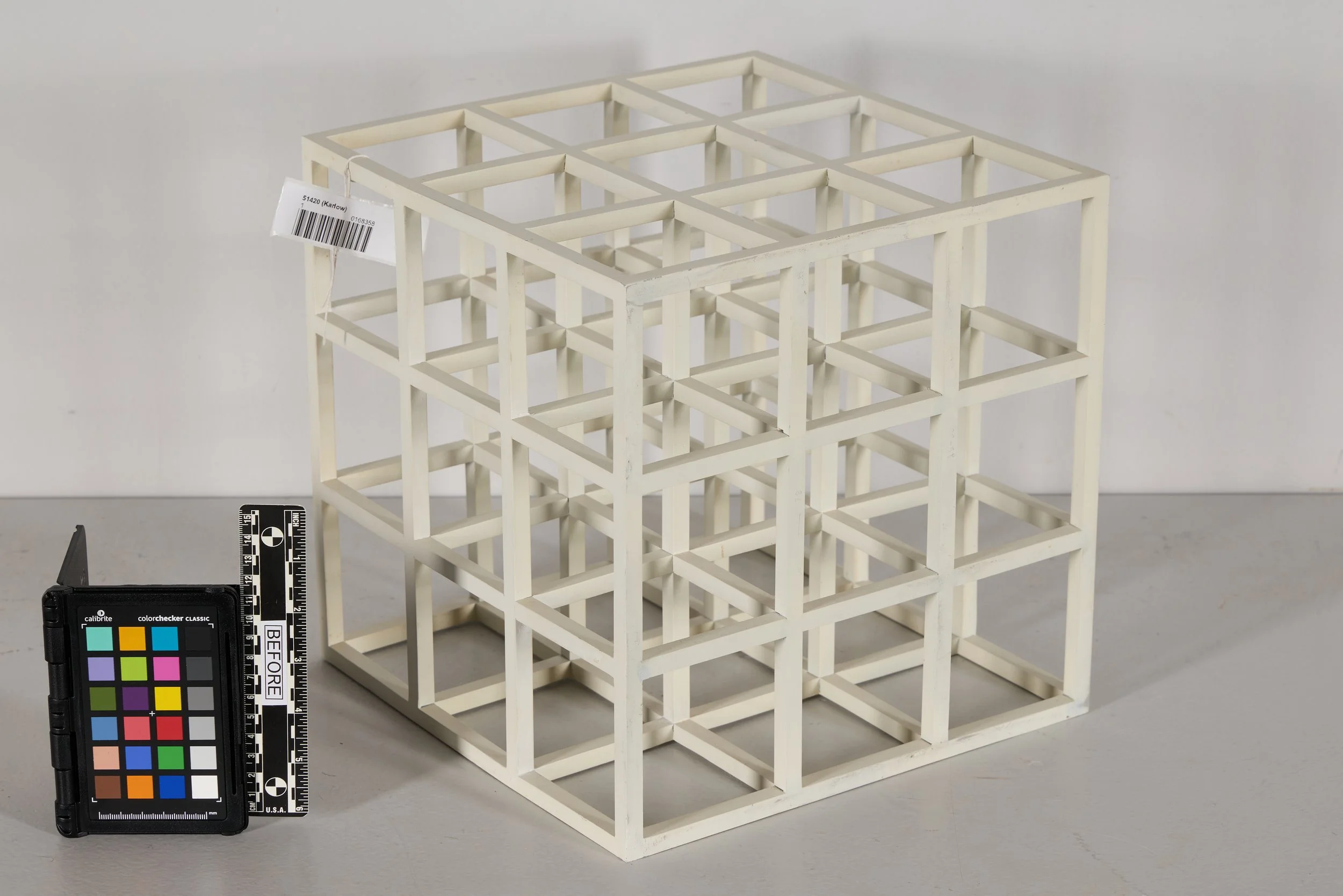 Cube, dated 1979 and signed on the base with a punched year and edition number, was constructed from square aluminum bar stock. The joints were welded and ground flat, and the surface was finished with white enamel paint. Subtle irregularities in the bars, including slight bowing and variations in thickness, were present and were understood as inherent to the fabrication process, particularly when compared with later, more mechanically precise examples from the series. Several joints displayed visible joint lines that had not been filled prior to painting, consistent with the original construction. While the structure remained stable overall, the surface exhibited heavy grime with minimal dust, scattered reddish-brown accretions, and black and grey accretions accompanied by scratches concentrated on one side, possibly the result of display in an unintended orientation. Minor paint losses and abrasions were present along the outer edges of the cube.