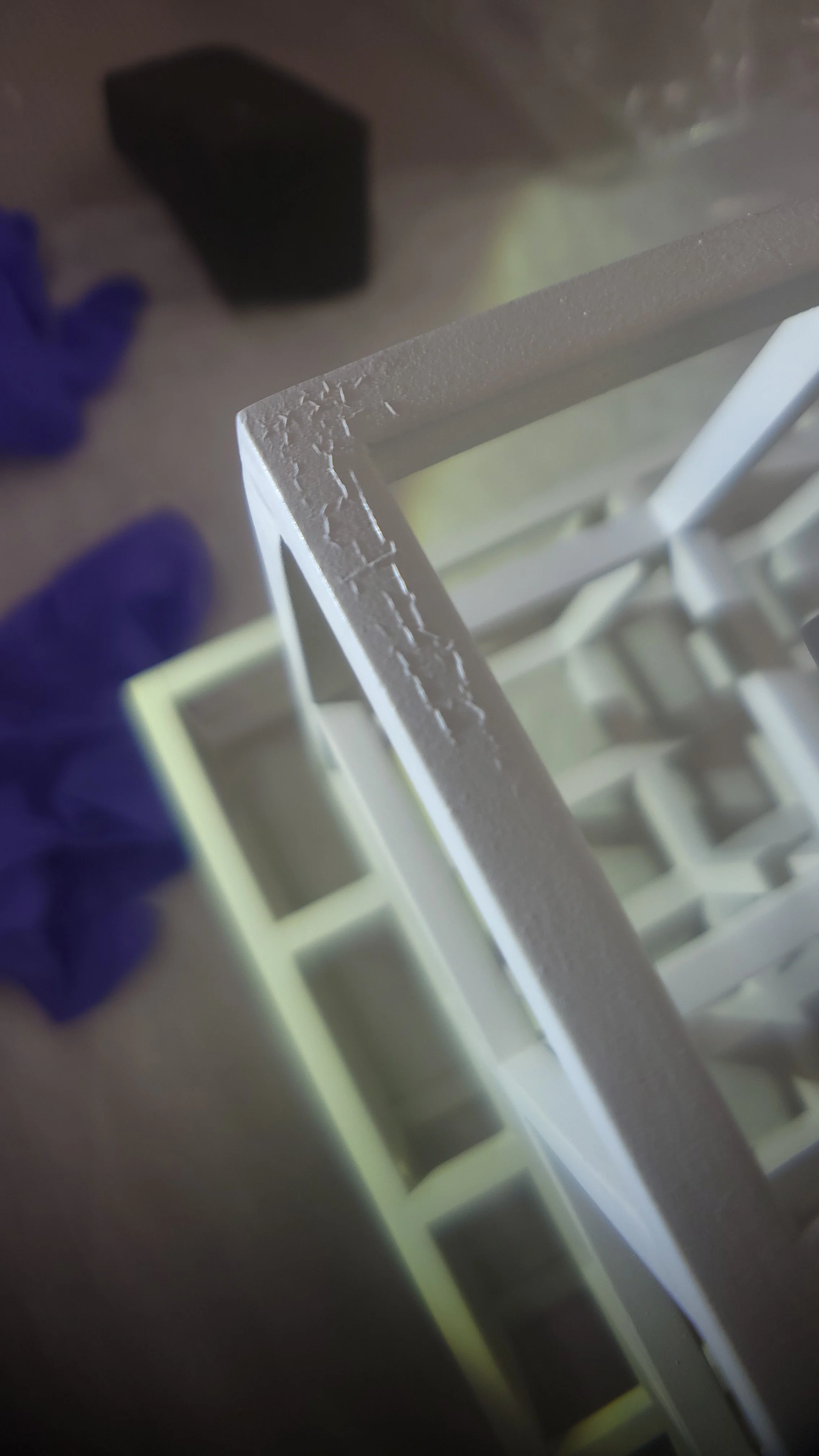 The second work, 4 x 4 x 1, was constructed from square aluminum bar stock assembled with metal pin joinery and spray-finished with white enamel paint. The sculpture consisted of four stacked rectangular tiers, each formed as a square grid, creating a vertical, tower-like structure. Condition issues varied across the tiers. In the upper tier, two joints were loose along one side, and multiple circular indentations from metal pins were visible at the outer edges of the vertical bars, some with associated paint loss. Cracking was present at nearly all joint lines, along with localized paint losses, black accretions, and surface grime. The second tier exhibited more pronounced structural instability, including complete separation at several joints connecting the upper grid, with gaps ranging from hairline fractures to approximately one-eighth of an inch. These separations were accompanied by cracking at lap joints, paint losses, brown accretions, and accumulated grime. The third tier showed more limited paint cracking and losses, minor abrasions at the outer corners, and evidence of a small prior paint repair. The bottom tier displayed moderate cracking at the joints, abrasions at exposed edges, black accretions, paint losses at pin locations, and several earlier restorations that were visually mismatched and excessively applied.